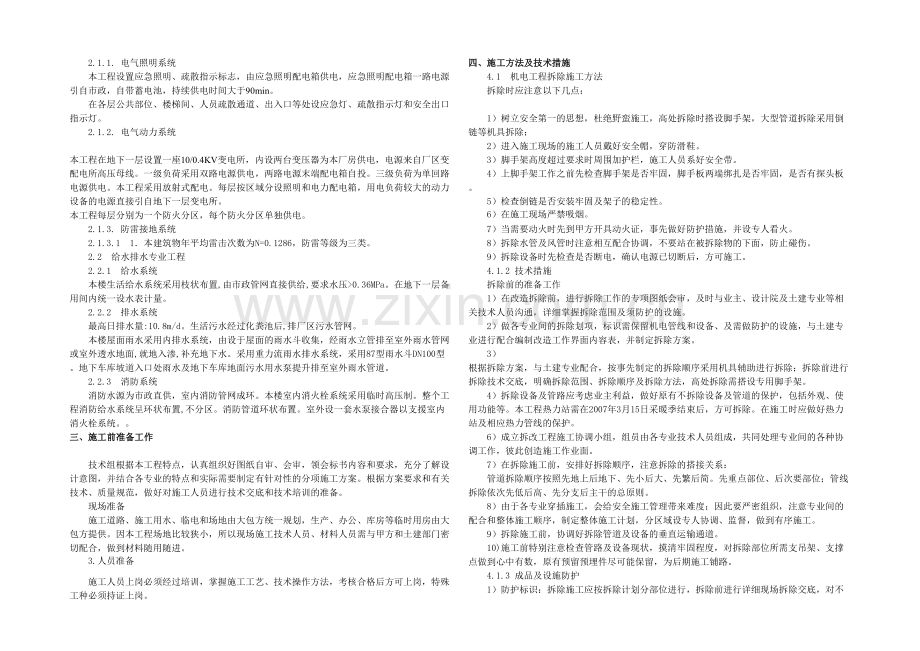 1)防护标识:拆除施工应按拆除计划分部位进行,拆除前进行详细现场拆除交底,对不拆除或留用的设备及管道,核对图纸一一对应做好标识;