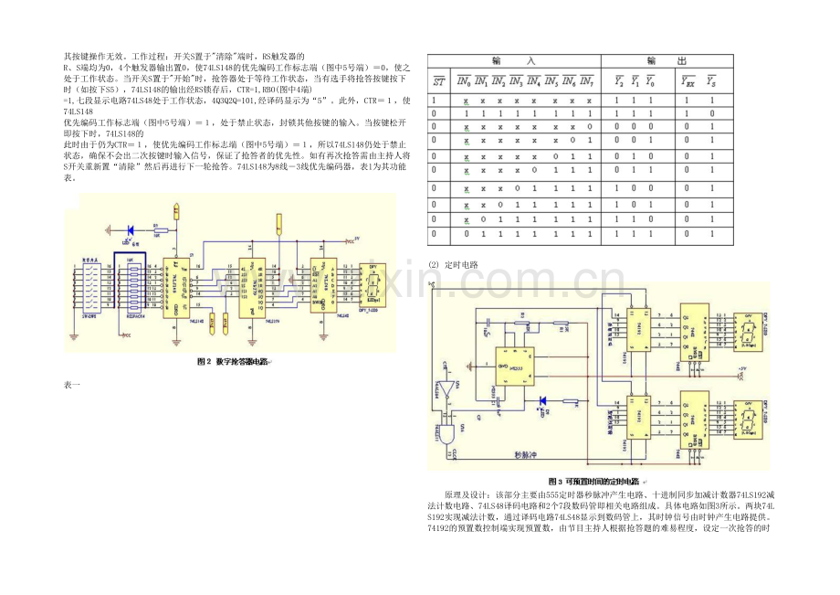 2.单元电路设计 (1) 抢答器电路 设计电路如图2所示。电路选用优先编码器 74LS148 和锁存器 74LS297 来完成。该电路主要完成两个功能:一是分辨出选手按键的先后,并锁存优先抢答者的编号,同时译码显示电路显示编号(显示电路采用七段数字数码显示管);二是禁止其他选手按键,其按键操作无效。工作过程:开关S置于"清除"端时,RS触发器的 R、S端均为0,4个触发器输出置0,使74LS148的优先编码工作标志端(图中5号端)=0,使之处于工作状态。当开关S置于"开始"时,抢答器处于等待工作状态,当有选手将抢答按键按下时(如按下S5),74LS148的输出经RS锁存后,CTR=1,RBO(图中4端) =1,七段显示电路74LS48处于工作状态,4Q3Q2Q=101,经译码显示为“5”。此外,CTR=1,使74LS148 优先编码工作标志端(图中5号端)=1,处于禁止状态,封锁其他按键的输入。当按键松开即按下时,74LS148的 此时由于仍为CTR=1,使优先编码工作标志端(图中5号端)=1,所以74LS148仍处于禁止状态,确保不会出二次按键时输入信号,保证了抢答者的优先性。如有再次抢答需由主持人将S开关重新置“清除”然后再进行下一轮抢答。74LS148为8线-3线优先编码器,表1为其功能表。