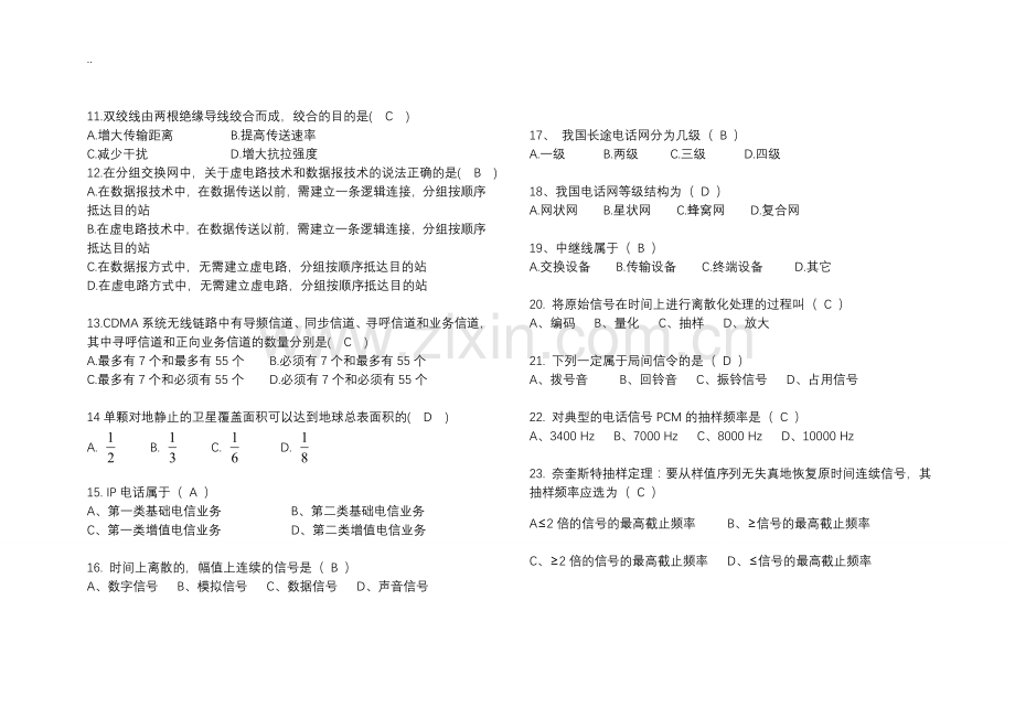 23. 奈奎斯特抽样定理:要从样值序列无失真地恢复原时间连续信号,其抽样频率应选为( C )