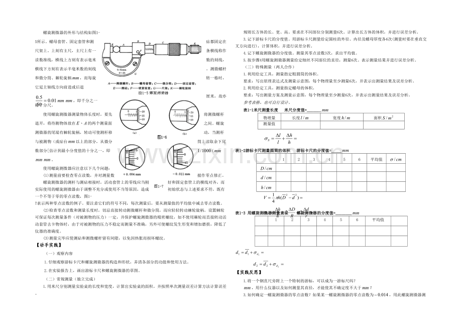 1.仔细观察游标卡尺和螺旋测微器的构造和形状,弄清各部分的功能和使用方法。