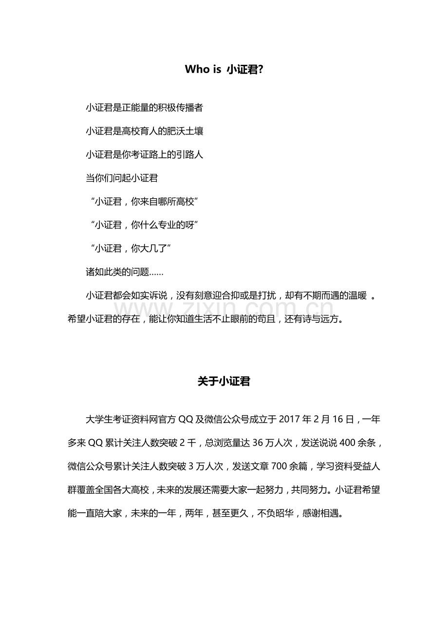 大学生考证资料网官方QQ及微信公众号成立于2017年2月16日,一年多来QQ累计关注人数突破2千,总浏览量达36万人次,发送说说400余条,微信公众号累计关注人数突破3万人次,发送文章700余篇,学习资料受益人群覆盖全国各大高校,未来的发展还需要大家一起努力,共同努力。小证君希望能一直陪大家,未来的一年,两年,甚至更久,不负昭华,感谢相遇。