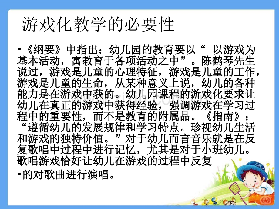 幼儿园歌唱活动幼儿园歌唱活动小班案例:找朋友小班案例:找朋友 游戏化教学的必要性纲要中指出:幼儿园的教育要以纲要中指出:幼儿园的教育要以“以游戏为以游戏为基本活动,寓教育于各项活动之中基本活动,寓教育于各项活动之中”。陈鹤琴先生。陈鹤琴先生说过,游戏是儿童的心理特征,游戏是儿童的工作,说过,游戏是儿童的心理特征,游戏是儿童的工作,游戏是儿童的生命,从某种意义上说,幼儿的各种游戏是儿童的生命,从某种意义上说,幼儿的各种能力是在游戏中获的。幼儿园课程的游戏化要求让能力是在游戏中获的。幼儿园课程的游戏化要求让幼儿在真正的游戏中获得经验,强调游戏在学习过幼儿在真正的游戏中获得经验,强调游戏在学习过程中的重要性,而不是教育的附属品。程中的重要性,而不是教育的附属品。指南:指南:“遵循幼儿的发展规律和学习特点。珍视幼儿生活遵循幼儿的发展规律和学习特点。珍视幼儿生活和游戏的独特价值。和游戏的独特价值。”对于幼儿而言音乐就是在反对于幼儿而言音乐就是在反复歌唱中过程中进行记忆,尤其是对于小班幼儿。复歌唱中过程中进行记忆,尤其是对于小班幼儿。歌唱游戏恰好让幼儿在游戏的过程中反复歌唱游戏恰好让幼儿在游戏的过程中反复的对歌曲进行演唱。的对歌曲进行演唱。“教什么?教什么?”本次活动主要教授本次活动主要教授 幼儿演唱歌曲找朋友幼儿演唱歌曲找朋友。“学什么?学什么?”本次活动主要需要幼儿学习演唱歌曲找本次活动主要需要幼儿学习演唱歌曲找朋友,知道找朋友的含义。朋友,知道找朋友的含义。“怎么教?怎么教?”在本次活动中,我主要采用的是示范法,在歌唱在本次活动中,我主要采用的是示范法,在歌唱方面的示范方面的示范。在与幼儿商量如何用好听的声音演。在与幼儿商量如何用好听的声音演唱的时候运用了谈话法。多次尝试游戏运用到了唱的时候运用了谈话法。多次尝试游戏运用到了练习法。练习法。“怎么学?怎么学?”本次活动考虑到小班幼儿年龄较小,基本上都采本次活动考虑到小班幼儿年龄较小,基本上都采用直观教学法,幼儿可以非常直观的从图用直观教学法,幼儿可以非常直观的从图谱,教师动作等地方学习到。谱,教师动作等地方学习到。“为什么这样教?为什么这样教?”考虑到本班的大多为视觉性,所以在教授方法的考虑到本班的大多为视觉性,所以在教授方法的安排上,我大多采取的都是示范法,演示法,便安排上,我大多采取的都是示范法,演示法,便于幼儿更加直观的得知。并且小班幼儿是直观形于幼儿更加直观的得知。并且小班幼儿是直观形象思维,图谱,示范等能更好的帮助幼儿思考。象思维,图谱,示范等能更好的帮助幼儿思考。根据课程游戏化,在活动中安排少量游戏,更能根据课程游戏化,在活动中安排少量游戏,更能吸引幼儿注意,在不知不觉中反复练习。吸引幼儿注意,在不知不觉中反复练习。“为什么这样学?为什么这样学?”纲要中指出教师的指导是要有利于幼纲要中指出教师的指导是要有利于幼儿主动、有效的学习。所以教师要儿主动、有效的学习。所以教师要引导幼儿自己去发现,而不是由老引导幼儿自己去发现,而不是由老师给出答案。师给出答案。纲要明确指出纲要明确指出:艺术是实施美育的重要艺术是实施美育的重要途径途径,要充分发挥音乐的情感教育功能要充分发挥音乐的情感教育功能,促促进幼儿健全人格的形成进幼儿健全人格的形成.由此可见音乐教育由此可见音乐教育对幼儿成长有着至关重要的作用。选择适对幼儿成长有着至关重要的作用。选择适合幼儿现有生活经验的音乐游戏也是至关合幼儿现有生活经验的音乐游戏也是至关重要的。所以说在音乐的选材上,以及进重要的。所以说在音乐的选材上,以及进行方式上都非常重要。行方式上都非常重要。幼儿:根据本班幼儿特点总结幼儿:根据本班幼儿特点总结本班的幼儿年龄相对较小,大部分幼儿都是十分活泼的,但是本班幼儿的学习能力强。大部分幼儿都表现出了对有一极大的兴趣,大部分幼儿都是十分配合的。本班幼儿的学习能力整体较强,在理解力和想象力上较为突出。重难点针对本班幼儿的性格特点、能力特点,我安排了一下重难点:重点:学会邀请舞动作。难点:能够两两进行舞蹈。找朋友的设计类型先理性,后感性先理性,后感性先理性,后感性的作用先理性,后感性的作用 本次活动重点在于对歌曲的学习,游戏所体现的作本次活动重点在于对歌曲的学习,游戏所体现的作用是帮助幼儿更加有趣的学习。音乐游戏是建立在用是帮助幼儿更加有趣的学习。音乐游戏是建立在对歌曲熟悉的前提下,只有在歌曲和对歌曲熟悉的前提下,只有在歌曲和 规则都习得熟规则都习得熟练流畅后才能体会游戏带来的乐趣练流畅后才能体会游戏带来的乐趣!投入学习的前!投入学习的前提是产生动机!提是产生动机!幼儿园歌唱游戏活动的总流程幼儿园歌唱游戏活动的总流程一段式:一段式:导入导入 新授新授 游戏游戏三段式:三段式:复习复习 新授新授 游戏游戏找朋友的层级设计:找朋友的层级设计:游戏游戏 新授新授 导入导入导入:导入:采用玩偶唱着歌找来自己的好朋友进行导采用玩偶唱着歌找来自己的好朋友进行导入。入。作用:玩偶的使