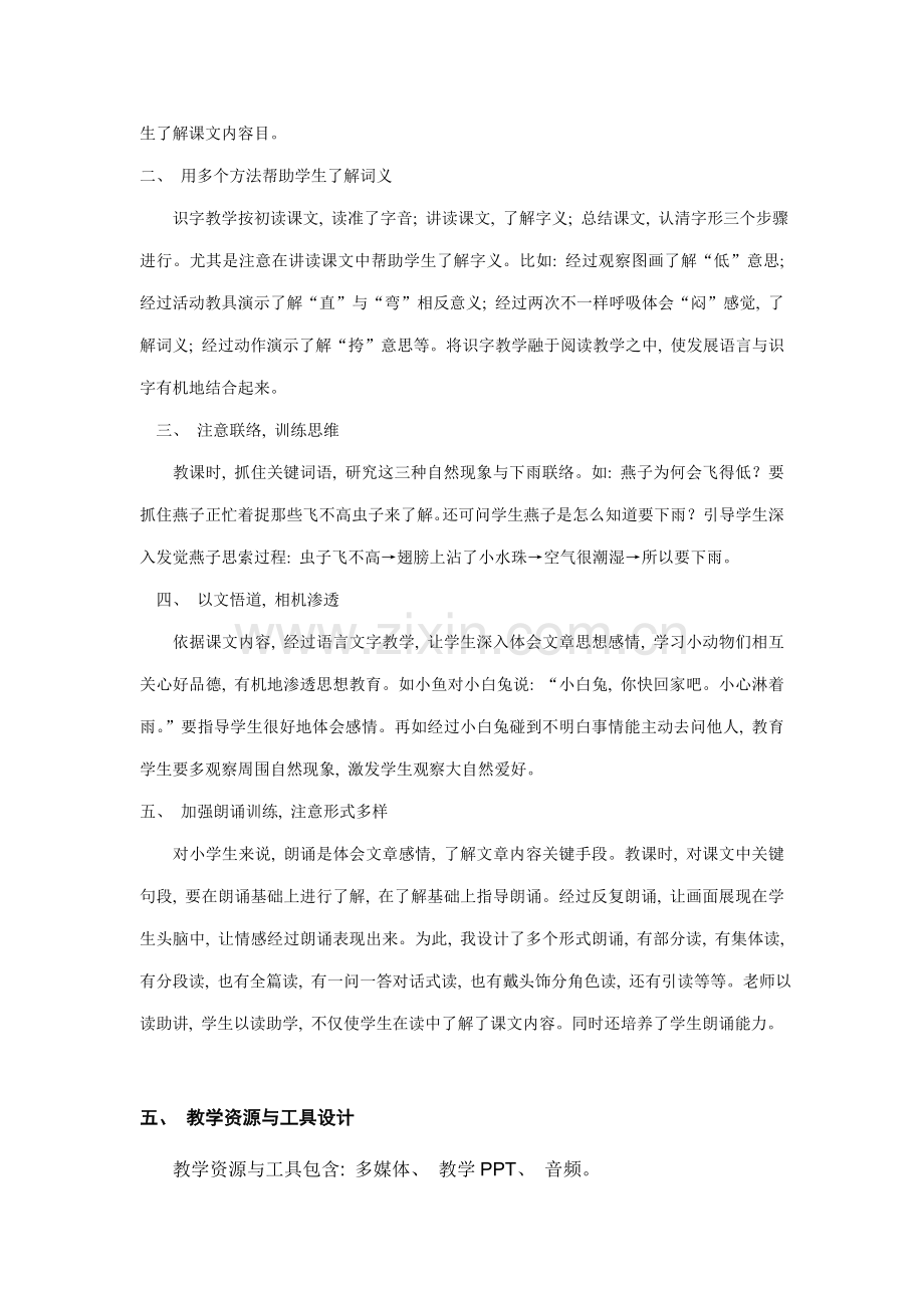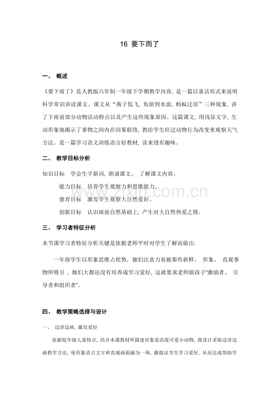 《要下雨了》是人教版六年制一年级下学期教学内容, 是一篇以童话形式来说明科学常识讲读课文。课文从“燕子低飞, 鱼游到水面, 蚂蚁迁居”三种现象, 讲了下雨前部分动物活动特点以及产生这些现象原因。这篇课文, 用浅显文字, 生动形象地揭示了事物之间内在因果联络, 教给学生经过动物行为改变来观察天气方法。是一篇学习语文训练语言好教材, 读来饶有趣味。