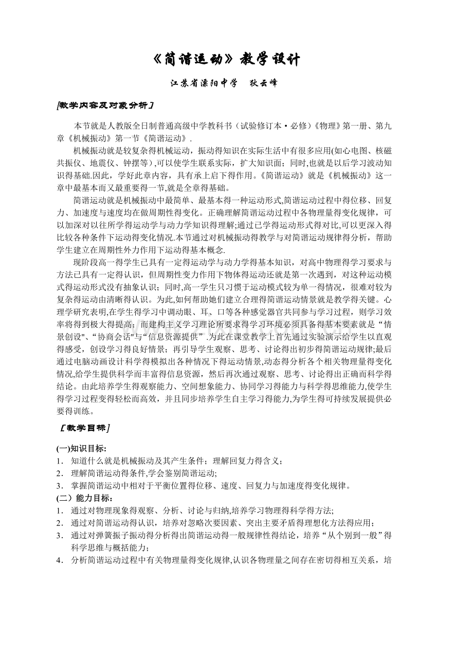 简谐运动就是机械振动中最简单、最基本得一种运动形式,简谐运动过程中得位移、回复力、加速度与速度均在做周期性得变化。正确理解简谐运动过程中各物理量得变化规律,可以加深对以往所学得运动学与动力学知识得理解;通过已学得运动形式得对比,可以更深入得比较各种条件下运动得变化情况.本节通过对机械振动得教学与对简谐运动规律得分析,帮助学生建立在周期性外力作用下运动得基本概念.