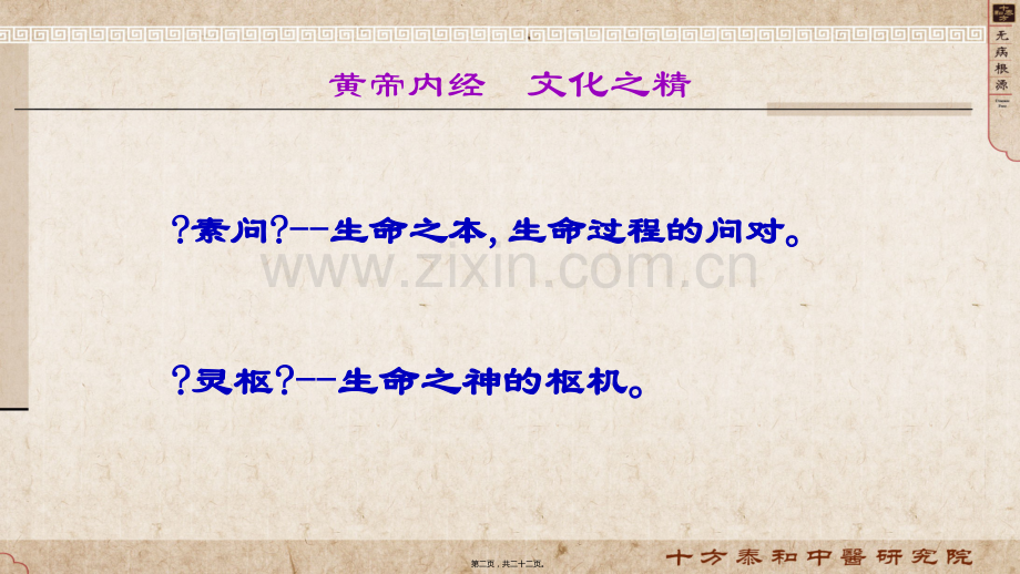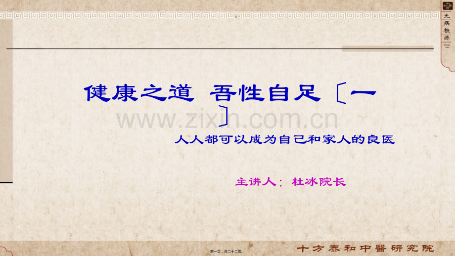 健康之道 吾性自足一主讲人:杜冰院长人人都可以成为自己和家人的良医第一页,共二十二页。黄帝内经 文化之精?素问素问?-?-生命之本生命之本,生命过程的问对。生命过程的问对。?灵枢灵枢?-?-生命之神的枢机。生命之神的枢机。第二页,共二十二页。?黄帝内经?是中华民族大一统思想的表达,是中华民族大智慧创造的蓝图,是全面揭示生命大道的经典巨著。中医属于医道,而不仅是医学。习近平:中医是翻开中华文明宝库的钥匙 重新认识 黄帝内经第三页,共二十二页。?灵枢灵枢.师传师传?黄黄帝帝曰曰:余余闻闻先先师师,有有所所心心藏藏,弗弗着着于于方方,余余愿愿闻闻而而藏藏之之,那那么么而而行行之之,上上以以治治民民,下下以以治治身身,使使百百姓姓无无病病,上上下下和和亲亲,德德泽泽下下流流,子子孙孙无无优优,传传于于后后世世,无无有有终时,可得闻乎?终时,可得闻乎?岐岐伯伯曰曰:远远乎乎哉哉问问也也。夫夫治治民民与与自自治治,治治彼彼与与治治此此,治治小小与与治治大大,治治国国与与治家,未有逆而能治之也,夫惟顺而已矣。治家,未有逆而能治之也,夫惟顺而已矣。重新认识 黄帝内经第四页,共二十二页。?素问素问 金匮真言论金匮真言论?:故善为脉者,谨察五藏六腑。故善为脉者,谨察五藏六腑。一逆一从,阴阳表里,雌雄之纪藏之心意,合心于精。一逆一从,阴阳表里,雌雄之纪藏之心意,合心于精。非其人勿教,非其真勿授非其人勿教,非其真勿授,是谓得道是谓得道医道传承 金匮真言第五页,共二十二页。?素问素问.上古天真论上古天真论?岐岐伯伯对对曰曰上上古古之之人人,其其知知道道者者,法法于于阴阴阳阳,和和于于术术数数,食食饮饮有有节节,起起居居有有常常,不不妄妄作作劳劳,故故能能形形与与神神俱俱,而而尽尽终终其其天天年年,度度百百岁乃去。岁乃去。今今时时之之人人不不然然也也,以以酒酒为为浆浆,以以妄妄为为常常,醉醉以以入入房房,以以欲欲竭竭其其精精,以以耗耗散散其其真真,不不知知持持满满,不不时时御御神神,务务快快其其心心,逆逆于于生生乐乐,起起居居无节,故半百而衰也。无节,故半百而衰也。道法自然 天人合一第六页,共二十二页。自然:就是自然而然 无限自在。自为始,然为终自然寓含著相互关系,寓含著相互作用,寓含著有无寓含著无限寓含著过程。一切都在相互作用中,一切都在无限运动中,一切都在有无之中,一切都是过程。道法自然 天人合一第七页,共二十二页。?素问素问.宝命全形论宝命全形论?天天覆覆地地载载,万万物物悉悉备备,莫莫贵贵于于人人;人人以以天天地地之之气气生生,四四时时之之法法成成夫人生于地,悬命于天,天地合气,命之曰人。夫人生于地,悬命于天,天地合气,命之曰人。人与环境不仅发生于共同的自然根源人与环境不仅发生于共同的自然根源,而且遵循着共同的时空法那么。而且遵循着共同的时空法那么。人具足天地之全息,位列三才,为万物之灵。人具足天地之全息,位列三才,为万物之灵。道法自然 天人合一第八页,共二十二页。?素问素问.四气调神大论四气调神大论?故故阴阴阳阳四四时时者者,万万物物之之终终始始也也,死死生生之之本本也也;逆逆之之那那么么灾灾害害生生,从从之之那那么苛疾不起,是谓得道。么苛疾不起,是谓得道。是是故故圣圣人人不不治治已已病病治治未未病病,不不治治已已乱乱治治未未乱乱,此此之之谓谓也也。夫夫病病已已成成而而后后药之,乱已成而后治之,药之,乱已成而后治之,譬犹渴而穿井,譬犹渴而穿井,斗而铸锥,斗而铸锥,不亦晚乎不亦晚乎!生命之道 至精至微第九页,共二十二页。?灵枢.九针十二原?节之交,三百六十五会.所言节者,神气之所游行出入也,非皮肉筋骨也。所谓经脉循行路线,实际上是俞窍的连结线。而俞窍乃是交会空间边界的集合。经络是无限的网络,如天网之疏而不失。经络不是具体的实质与形态,经络显示神气的游行出入,俞窍显示神气的转输交会。经络俞窍 贯穿无有第十页,共二十二页。经络属于生命活动的联系方式,贯穿有无两境。经络是生命空间与场及粒子的运变,及物质的连续性与波动性。其波动方式为:点点激发、点点成线、线线归窍、总窍在心经络俞窍 贯穿无有第十一页,共二十二页。?灵枢灵枢.经别经别?十二经脉者,此五脏六腑之所以应天道。十二经脉者,此五脏六腑之所以应天道。夫十二经脉者,人之所以生,病之所以成,人之所以治,病之所以起,学之夫十二经脉者,人之所以生,病之所以成,人之所以治,病之所以起,学之所始,工之所止也。所始,工之所止也。大道至简 经穴妙用?灵枢灵枢.经脉经脉?经脉者,所以能决死生、处百病、调虚实,不可不通。经脉者,所以能决死生、处百病、调虚实,不可不通。第十二页,共二十二页。大道至简 经穴妙用?医醇胜义?:“疾病虽多,不越内伤外感、缺乏者补之,以复其正,有余者去之、以归于平、缓治也.天下无神奇之法、只有平淡之法,平淡至极乃为神奇。中医通过对经络俞窍的作用,而实现对生命过程的统一协调就是本于此理。如导引按摩推拿点穴拔罐刮痧等,就是提供了一些极其简单,而又易于广阔群众接受的养生和调治的方法。第十三页,共二十二页。神气形以神为本,以气为用,以形为宇。形者生之舍,气者生之充。神者生之制。