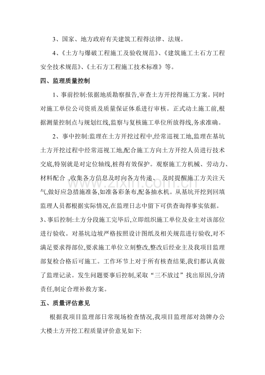 根据我项目监理部日常现场检查情况,我项目监理部对劲牌办公大楼土方开挖工程质量评价意见如下: