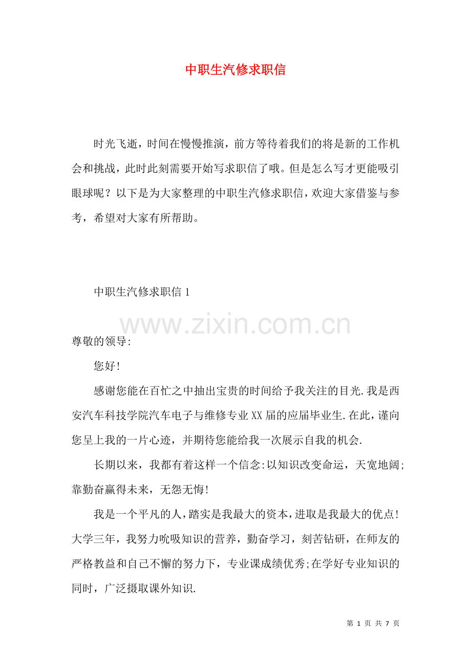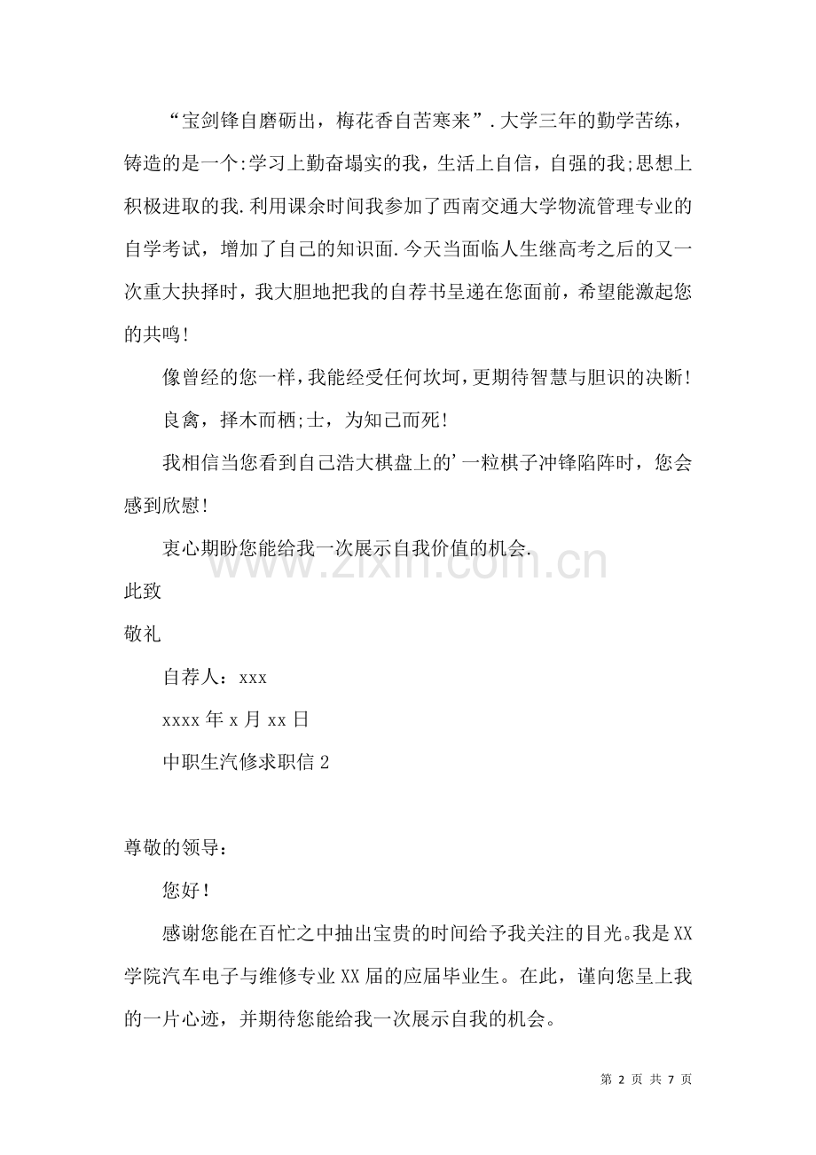 时光飞逝,时间在慢慢推演,前方等待着我们的将是新的工作机会和挑战,此时此刻需要开始写求职信了哦。但是怎么写才更能吸引眼球呢?以下是为大家整理的中职生汽修求职信,欢迎大家借鉴与参考,希望对大家有所帮助。