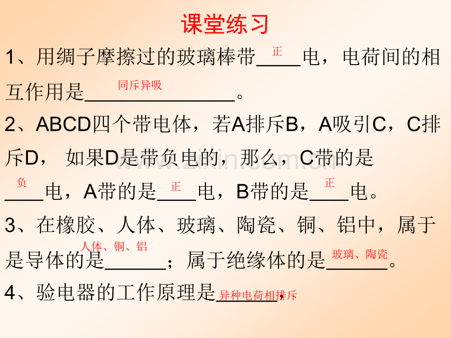 课堂练习1、用绸子摩擦过的玻璃棒带 电,电荷间的相互作用是 。2、ABCD四个带电体,若A排斥B,A吸引C,C排斥D,如果D是带负电的,那么,C带的是 电,A带的是 电,B带的是 电。3、在橡胶、人体、玻璃、陶瓷、铜、铝中,属于是导体的是 ;属于绝缘体的是 。4、验电器的工作原理是 ,正同斥异吸负正正人体、铜、铝玻璃、陶瓷异种电荷相排斥课堂练习课堂练习2、甲、乙、丙、丁四个小球,若甲与经绸、甲、乙、丙、丁四个小球,若甲与经绸子摩擦过的玻璃棒互相吸引,乙排斥甲,子摩擦过的玻璃棒互相吸引,乙排斥甲,丙吸引乙,丁吸引丙,则丁球(丙吸引乙,丁吸引丙,则丁球()A、一定不带电一定不带电 B、不能带正电不能带正电C、一定带负电一定带负电 D、不带电或带负电不带电或带负电D 设想:设想:假如没假如没有电,我们的生活有电,我们的生活将是何种情境?将是何种情境?2008年年2月,湖南郴州受严重冰雪灾害影响,月,湖南郴州受严重冰雪灾害影响,多处高压输电塔及电杆倒塌,全市电力设施遭多处高压输电塔及电杆倒塌,全市电力设施遭到严重破坏,大部分城区出现断电到严重破坏,大部分城区出现断电。2008.5.12汶川大地震汶川大地震,电网被严重毁坏,电网被严重毁坏,受灾区与外界联系中断。受灾区与外界联系中断。5.2 5.2 电流和电路电流和电路1.电流电流2.电路和构成电路和构成3.电路图电路图本节导航本节导航金属导体为例:水轮机水轮机 水流通过轮机,能水流通过轮机,能使水轮机转动起来。使水轮机转动起来。电流通过灯丝电流通过灯丝,能使灯泡发光。能使灯泡发光。水流水流(1)水流水流与与电流电流类比类比电流电流灯泡灯泡(2)电流形成的原理)电流形成的原理自由电子自由电子平时它们运动的方向杂乱无章平时它们运动的方向杂乱无章 接上电池后,它们就受到了推动力,接上电池后,它们就受到了推动力,出现了定向移动。出现了定向移动。导体中自由电荷的定向移动形成导体中自由电荷的定向移动形成电流电流。正电荷移动的方向正电荷移动的方向规定为电流的方向。规定为电流的方向。当电路闭合时,在当电路闭合时,在电源外部电源外部,电流的方向,电流的方向是从是从电源正极电源正极经过用电器流向经过用电器流向负极负极。电路中的电流的方向:电路中的电流的方向:正极正极用电器用电器负极负极(3)电流的方向)电流的方向二极管二极管 这种电子元件中的电流只能从它的这种电子元件中的电流只能从它的一端流向另一端,不能反向流动。一端流向另一端,不能反向流动。特点:特点:单向导电性单向导电性电源及其能量转化电源及其能量转化电源的能量转化电源的能量转化各种形式的能转化为电能各种形式的能转化为电能提供电能提供电能使用电池应注意什么?钮扣电池钮扣电池蓄电池蓄电池干电池干电池各各 种种 电电 池池锂离子电池锂离子电池太阳能电池板太阳能电池板镍氢电池镍氢电池2.各种用电器各种用电器消耗电能消耗电能用电器的能量转化用电器的能量转化电能转化为各种形式的能电能转化为各种形式的能3、开关:、开关:控制电路通断控制电路通断连接电路元件,提供电流的流动路径连接电路元件,提供电流的流动路径4.导线:导线:2、电路的构成、电路的构成用电器:用电器:灯泡、电动机、门铃灯泡、电动机、门铃电源:电源:电池、电池、发电机发电机等。等。开关开关导线导线(提供电能的装置)(提供电能的装置)(消耗电能的装置)(消耗电能的装置)家庭电路中的家庭电路中的电流就是靠远方电电流就是靠远方电厂中的厂中的发电机发电机来维来维持的。持的。只有只有 时,电路中才有电流。时,电路中才有电流。作用作用(控制电路)(控制电路)(连接电路)(连接电路)电路闭合电路闭合3.电路图电路图电路电路电路图电路图 用用规定的符号规定的符号表达电路的连表达电路的连接情况,这样的图叫电路图。接情况,这样的图叫电路图。元件位置安排要适当,分布要均匀元件位置安排要适当,分布要均匀这样画好吗画电路图的要求画电路图的要求实物连线图实物连线图电路图电路图这样画怎么样元件位置安排要适当,分布要均匀元件位置安排要适当,分布要均匀,画电路图的要求画电路图的要求元件不要画在拐角处元件不要画在拐角处。整个电路图最好呈整个电路图最好呈长方形长方形,有,有棱有角,导线要棱有角,导线要横平竖直横平竖直。这样呢画电路图的要求画电路图的要求元件位置安排要适当,分布要均匀,元件位置安排要适当,分布要均匀,元件不要画在拐角处。整个电路图最元件不要画在拐角处。整个电路图最好呈长方形,有棱有角,导线要横平好呈长方形,有棱有角,导线要横平竖直。竖直。画电路图的要求画电路图的要求画电路图的要点画电路图的要点:1.1.电路元件应位于矩形线框得框线上电路元件应位于矩形线框得框线上.线路要画线路要画得简洁、整齐、美观、布局合理得简洁、整齐、美观、布局合理。2.2.电路元件电路元件不允许不允许画在电路图的拐角处画在电路图的拐角处.3.3.注意开关的开闭状态注意开关的开闭状态.4.4.从电源从电源+极(极(-极)画起极)画起,依次连接各电路元件依次连接各电路元件.1.电流电流形成的原因:形成的原因:方向:方向:2.电路的组成:电路的组成:正电荷的移动方向为