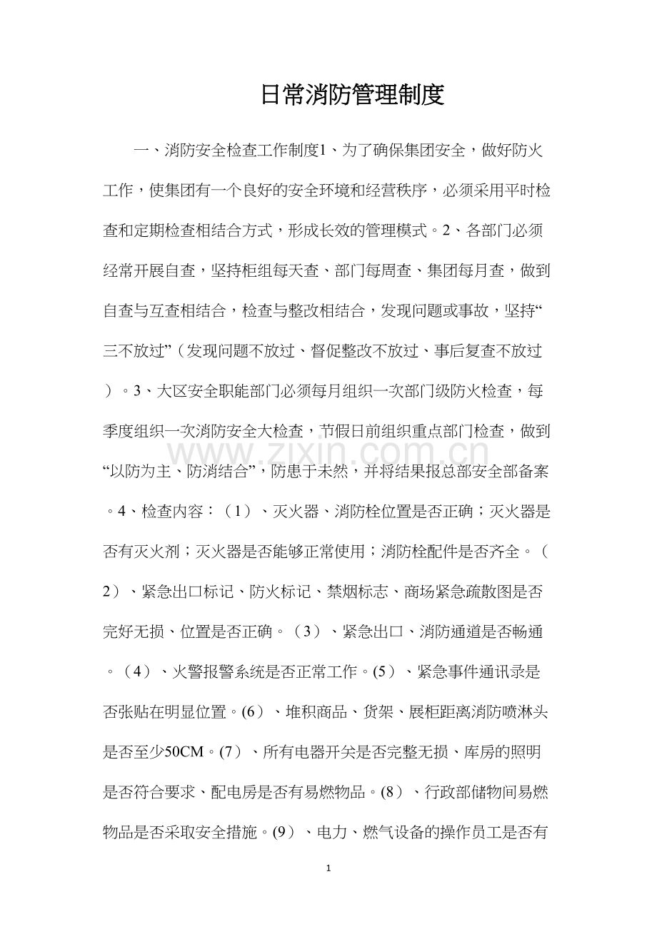 一、消防安全检查工作制度1、为了确保集团安全,做好防火工作,使集团有一个良好的安全环境和经营秩序,必须采用平时检查和定期检查相结合方式,形成长效的管理模式。2、各部门必须经常开展自查,坚持柜组每天查、部门每周查、集团每月查,做到自查与互查相结合,检查与整改相结合,发现问题或事故,坚持“三不放过”(发现问题不放过、督促整改不放过、事后复查不放过)。3、大区安全职能部门必须每月组织一次部门级防火检查,每季度组织一次消防安全大检查,节假日前组织重点部门检查,做到“以防为主、防消结合”,防患于未然,并将结果报总部安全部备案。4、检查内容:(1)、灭火器、消防栓位置是否正确;灭火器是否有灭火剂;灭火器是否能够正常使用;消防栓配件是否齐全。(2)、紧急出口标记、防火标记、禁烟标志、商场紧急疏散图是否完好无损、位置是否正确。(3)、紧急出口、消防通道是否畅通。(4)、火警报警系统是否正常工作。(5)、紧急事件通讯录是否张贴在明显位置。(6)、堆积商品、货架、展柜距离消防喷淋头是否至少50CM。(7)、所有电器开关是否完整无损、库房的照明是否符合要求、配电房是否有易燃物品。(8)、行政部储物间易燃物品是否采取安全措施。(9)、电力、燃气设备的操作员工是否有上岗证。(10)、每日是否有消防检查记录和存档记录。(11)、检查重点区域、重点部位和安全死角是否存在火险隐患,对隐患下达整改通知和整改情况的是否全部反馈。(12)、有无私拉乱接现象;有无违反消防管理规定而擅自使用热得快等禁止使用的电热器具;(13)、消防会议是否每周召开;是否互通信息;是否定期更新消防宣传栏并有最新的商场消防组名单。(14)、防损员以及商场员工是否会使用灭火器;消防演习是否定期进行;各项记录是否存档。(15)、商品库或小库内物品摆放是否堵塞通道,有无防火间距。(16)、商场内的消防疏散通道和安全出口有无堵塞;消防器材和设备有无掩盖和遮挡。(17)、重要设备的安全制度执行是否到位;电梯、扶梯是否有安全使用规定和警告标志;配电房、锅炉房是否有安全管理制度和安全操作规程及执行情况记录。(18)、各区域配电柜、配电箱和照明器具是否完好。(19)、配合上级有关部门开展的各项防火检查和同系统之间的相互检查,对查出问题落实整改。(20)、对上一次查出的消防安全隐患整改情况进行复查。二、消防整改措施制度1、检查出来的问题,能现场整改的应该立即整改。2、对不能立即整改的,以《安全整改通知书》的形式发到有关部门限期整改,有关部门在规定的期限内必须整改完毕,并将整改情况反馈到总部安全保卫部,否则造成后果责任自负。3、对确实难以整改的项目,由集团消防职能部门以报告的形式向上级汇报。三、商场防火制度1、实行逐级防火责任制,做到层层有专人负责。2、实行各部门各岗位防火责任制,做到所有部门的消防工作,明确有人负责管理,各部门均要签订《消防责任书》。3、安全管理部门应设立消防组防火档案、紧急灭火计划、消防演习报告、各种消防宣传教育的资料,全面负责商场的消防预防、培训工作。各营运部门则须具备完整的防火检查报告和电器设备使用报告等资料。4、商场内要张贴各种消防标志,设置消防门、消防通道和报警系统,组建义务消防队,配备完备的消防器材与设施,做到有能力迅速扑救初起火灾和能有效地进行人员财产的疏散转移。5、建立、健全各项消防安全检查制度,包括门卫、巡逻、逐级防火检查;完善用火、用电、易燃、易爆物品安全管理,消防器材维护保养,以及火灾事故报告、调查、处理等制度。6、对新老员工进行消防知识的普及和对消防器材使用培训。特别是消防重点部门要进行专门的消防培训和考核,做到经常化、制度化。7、商场内所有区域,包括销售区域、库房、办公区域、洗手间全部禁止吸烟和动用明火;存放大量物品的场地、仓库,必须设置明显的禁止烟火标志。8、商场内消防器材、消防栓必须按消防管理部门指定的明显位置放置。9、禁止私接电源插座、乱拉临时电线,私自拆修开关和更换保险丝等,如有需要,必须由工程人员、电工进行操作,所有临时电线都必须在现场有明确记录,并在期限内改装。10、商场内所有开关必须统一管理,每日的照明开关、电梯开关统一由防损员控制,其他电力系统由工程部门负责。如因工作需要而改由部门负责,则部门的管理人员和实际操作人员必须对开关的正确使用接受培训。11、营业及工作结束后,要进行电源关闭检查,保证各种电器不带电过夜,各种该关闭的开关处于关闭状态。12、各种电器设备、专用设备的运行和操作必须按规定进行操作,实行持证作业。13、柜台、陈列柜的射灯、广告灯等灯具工作结束后必须关闭,以防温度过高引起火灾。14、货架商品存放要与照明灯、镇流器、射灯、装饰灯、火警报警器、消防喷淋头、监视器保持一定间隔(垂直距离不少于50CM)。15、销售易燃品,如;丁烷气、发胶、果酒、塞路璐等,只能适量存放,便于通风,发现泄漏,挥发或溢出的现象要立即采取措施。16、商场内所有小库的消防必须符合要求,包括照明、喷淋系统、消防器材、设备、通风、通道等设备,商场内禁止吸烟、动用明火和乱拉乱接电线。17、保持消防通道、紧急疏散门畅通,