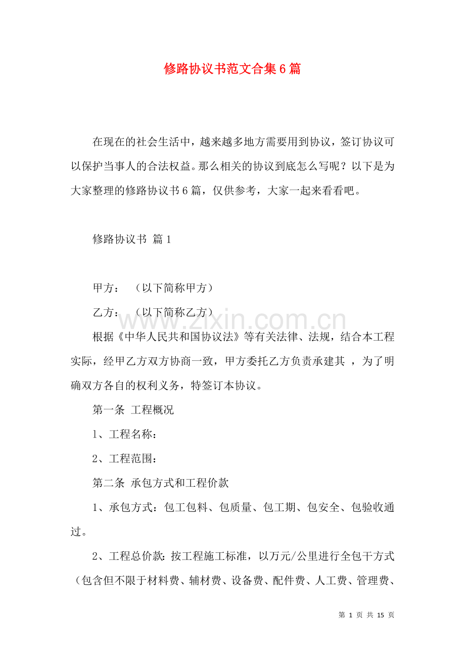 在现在的社会生活中,越来越多地方需要用到协议,签订协议可以保护当事人的合法权益。那么相关的协议到底怎么写呢?以下是为大家整理的修路协议书6篇,仅供参考,大家一起来看看吧。