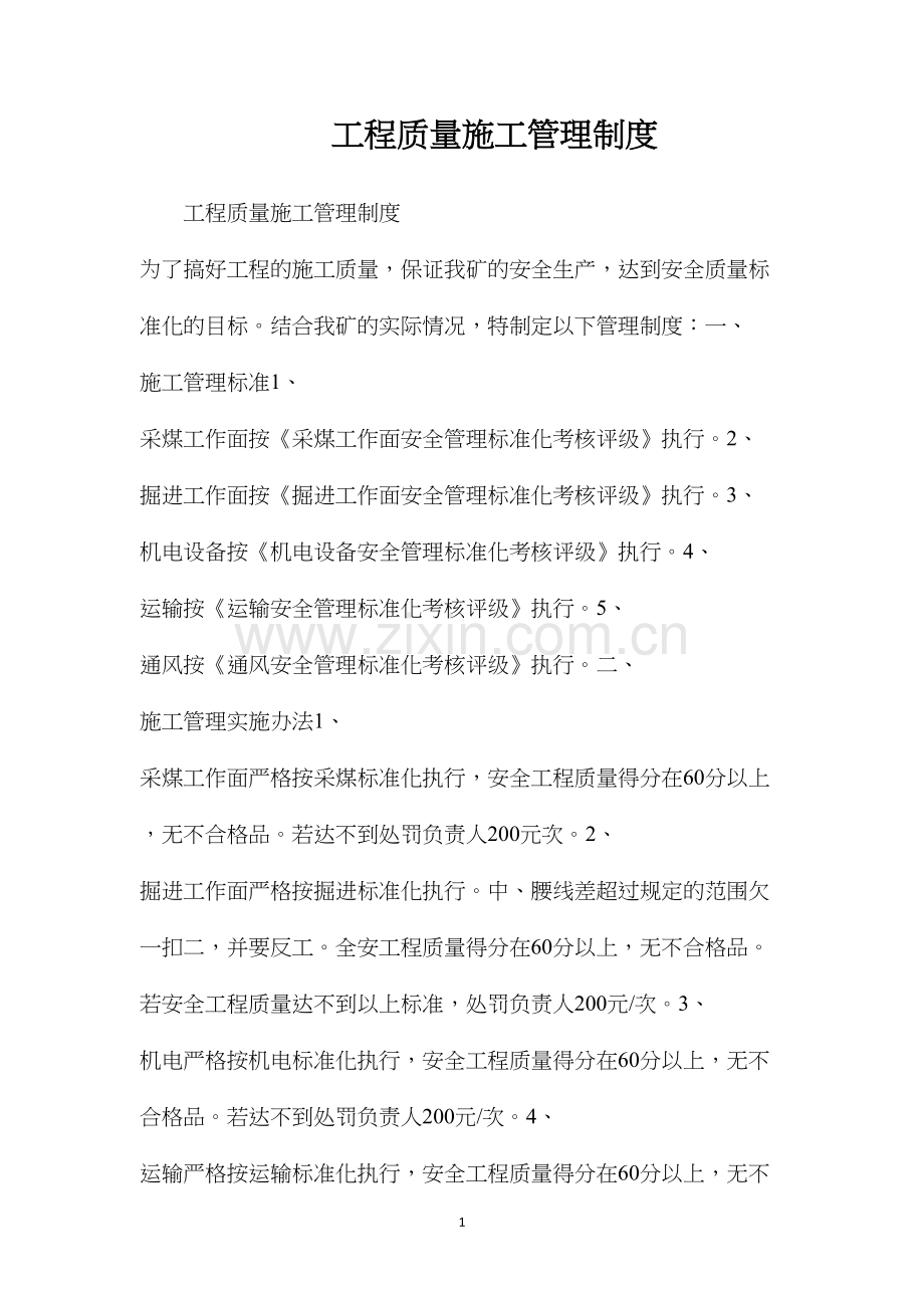工程质量施工管理制度 为了搞好工程的施工质量,保证我矿的安全生产,达到安全质量标准化的目标。结合我矿的实际情况,特制定以下管理制度:一、 施工管理标准1、 采煤工作面按《采煤工作面安全管理标准化考核评级》执行。2、 掘进工作面按《掘进工作面安全管理标准化考核评级》执行。3、 机电设备按《机电设备安全管理标准化考核评级》执行。4、 运输按《运输安全管理标准化考核评级》执行。5、 通风按《通风安全管理标准化考核评级》执行。二、 施工管理实施办法1、 采煤工作面严格按采煤标准化执行,安全工程质量得分在60分以上,无不合格品。若达不到处罚负责人200元次。2、 掘进工作面严格按掘进标准化执行。中、腰线差超过规定的范围欠一扣二,并要反工。全安工程质量得分在60分以上,无不合格品。若安全工程质量达不到以上标准,处罚负责人200元/次。3、 机电严格按机电标准化执行,安全工程质量得分在60分以上,无不合格品。若达不到处罚负责人200元/次。4、 运输严格按运输标准化执行,安全工程质量得分在60分以上,无不合格品。若达不到处罚负责人200元/次。5、 通风严格按通风标准化执行,安全工程质量得分在60分以上,无不合格品。若达不到处罚负责人200元/次。6、 若该项安全工程质量分达90分以上,优良品率在80%以上,奖该项负责人200元/次。三、 工程施工各项负责人1、 采煤二队负责人:龙洪达2、 采煤三队负责人:罗向东3、 掘进队负责人:彭德才4、 机电设备负责人:林志仁5、 运输负责人:邱仕奎6、 通风负责人:李顺广四、 检查人员及检查方法1、 检查人员由安全质量标准化领导小组成员和各部门负职,安全科、生产科管理人员组成。2、 检查方法:按照标准,每月进行一次检查。检查时分成以上几项,每项指排一名负责人,并对照检查标准进行检查。检查完后,该组成员全部在检查表上签字,并对该项检查的情况负责。3、 生产科测量组每月对掘进队所作的巷道要有一张工程质量验收表,结帐时严格按照验收的质量欠一扣二结帐。4、 测量组每月要对采煤队的支柱、方钢进行清点(特殊情况除外),做到支柱、方钢每月心中有数。并进行对比,看有无丢失现象,严格执行支柱、方钢考核。五、职责范围 各项负责人对自己所管辖的范围负责,要对现场安管员进行明确的分工,各项负责人和安管员、班组长对自己所施工的工程标准要明确,做到心中有数,对不格合的工程坚决反工。每月检查人员要对照表上的标准进行验收,对不合格的工程不与验收,并提出整改措施。