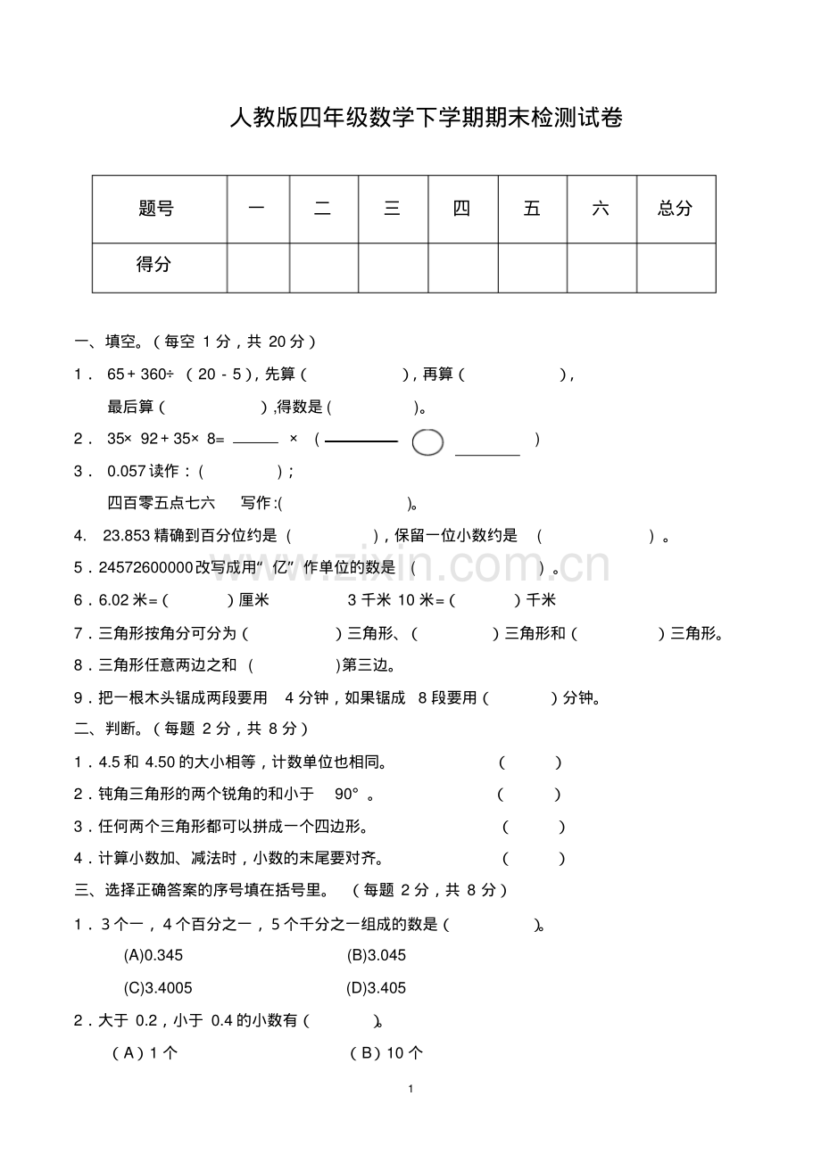 1 人教版四年级数学下学期期末检测试卷一、填空。(每空 1 分,共 20 分)1 65360(205),先算(),再算(),最后算(),得数是()。2 3592358=()3 0.057读作:();四百零五点七六写作:()。4.23.853 精确到百分位约是(),保留一位小数约是()。524572600000改写成用“亿”作单位的数是()。66.02 米=()厘米3 千米 10 米=()千米7三角形按角分可分为()三角形、()三角形和()三角形。8三角形任意两边之和()第三边。9把一根木头锯成两段要用4 分钟,如果锯成 8 段要用()分钟。二、判断。(每题 2 分,共 8 分)14.5 和 4.50 的大小相等,计数单位也相同。()2钝角三角形的两个锐角的和小于90。()3任何两个三角形都可以拼成一个四边形。()4计算小数加、减法时,小数的末尾要对齐。()三、选择正确答案的序号填在括号里。(每题 2 分,共 8 分)1个一,个百分之一,个千分之一组成的数是()。(A)0.345(B)3.045(C)3.4005(D)3.405 2大于 0.2,小于 0.4 的小数有()。(A)1 个(B)10 个题号一二三四五六总分得分2(C)100 个(D)无数个3拼成一个等腰梯型至少要用()个等边三角形。(A)1(B)2(C)3(D)4 4在长 90 米的跑道一侧插上10 面彩旗(两端都插),每相邻两面彩旗之间相距()米。(A)9(B)10(C)16(D)8 四、计算。(36分)1口算:(10 分)25436036=0.3100120610000.01331.40782.50.98.764.27102.32.72用竖式计算下面各题并验算。(4 分)103.06 11.368.54 3用小数计算。(4 分)5 米 23 厘米 3 米 5 分米10 千克 3 千克 600 克4计算下面各题,能简算的要简算。(18 分)(1257)8 3200254 3.276.42.734.6 2544 6.450.581.42 12(324285)26 3 五、操作。(每图 3 分,共 6 分)在方格纸上画一个等腰三角形和一个直角三角形并画出它们的高。六、解决问题。(22 分)1 修路队修一条公路,第一天修了 3.4 千米,比第二天多修了 0.6 千米,两天共修了多少千米?(5 分)2、一个等腰三角形的风筝,它的一个底角是70 度,顶角是多少度?(5 分)3一辆汽车从某城去省城,走高速公路的速度是90 千米/小时,用了 2 小时,返回时走普通公路的速度是70 千米/小时,用了3 小时,走普通公路比走高速公路多走多少千米?(6分)4 4.一辆货车一次可运货物9500 千克,5 辆这样的货车 2 次一共可以运多少千克货物?合多少吨?(6 分)