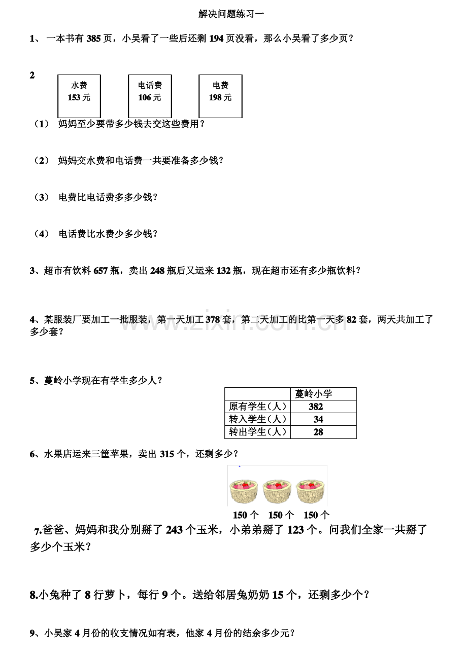 解决问题练习一解决问题练习一1 1、一本书有一本书有 385385 页,小吴看了一些后还剩页,小吴看了一些后还剩 194194 页没看,那么小吴看了多少页?页没看,那么小吴看了多少页?2 2水费水费电话费电话费电费电费153153 元元106106 元元198198 元元(1 1)妈妈至少要带多少钱去交这些费用?妈妈至少要带多少钱去交这些费用?(2 2)妈妈交水费和电话费一共要准备多少钱?妈妈交水费和电话费一共要准备多少钱?(3 3)电费比电话费多多少钱?电费比电话费多多少钱?(4 4)电话费比水费少多少钱?电话费比水费少多少钱?3 3、超市有饮料、超市有饮料 657657 瓶,卖出瓶,卖出 248248 瓶后又运来瓶后又运来 132132 瓶,现在超市还有多少瓶饮料?瓶,现在超市还有多少瓶饮料?4 4、某服装厂要加工一批服装,第一天加工、某服装厂要加工一批服装,第一天加工378378 套,第二天加工的比第一天多套,第二天加工的比第一天多 8282 套,两天共加工了套,两天共加工了多少套?多少套?5 5、蔓岭小学现在有学生多少人?、蔓岭小学现在有学生多少人?蔓岭小学蔓岭小学原有学生原有学生(人)(人)382382转入学生转入学生(人)(人)3434转出学生转出学生(人)(人)28286 6、水果店运来三筐苹果,卖出、水果店运来三筐苹果,卖出 315315 个,还剩多少?个,还剩多少?150150 个个150150 个个150150 个个7 7.爸爸、妈妈和我分别掰了爸爸、妈妈和我分别掰了 243243 个玉米,小弟弟掰了个玉米,小弟弟掰了 123123 个。问我们全家一共掰了个。问我们全家一共掰了多少个玉米?多少个玉米?8.8.小兔种了小兔种了 8 8 行萝卜,每行行萝卜,每行 9 9 个。送给邻居兔奶奶个。送给邻居兔奶奶 1515 个,还剩多少个?个,还剩多少个?9 9、小吴家、小吴家 4 4 月份的收支情况如有表,他家月份的收支情况如有表,他家 4 4 月份的结余多少元?月份的结余多少元?4 4 月月 1 1 日日4 4 月月 1 1 日日-15-15 日日4 4 月月 1616 日日4 4 月月 1616 日日-31-31 日日结余结余爸爸工资收入爸爸工资收入 873873 元元支出支出 468468 元元妈妈工资收入妈妈工资收入 865865 元元支出支出 555555 元元1010、学校有、学校有 10001000 元钱,买一个电元钱,买一个电饭锅和打印机后还剩多少钱?饭锅和打印机后还剩多少钱?583583 元元236236 元元1111、203203 元元8888 元元142142 元元(1 1)买一个玩具吊车和一副乒乓球拍要多少钱?买一个玩具吊车和一副乒乓球拍要多少钱?(2 2)买一副羽毛球拍和一副乒乓球拍压要多少钱?买一副羽毛球拍和一副乒乓球拍压要多少钱?(3 3)三样东西一起买要多少钱?)三样东西一起买要多少钱?1212、上手工课,一班节约了、上手工课,一班节约了 1515 张纸,二班比一班多节约了张纸,二班比一班多节约了 8 8 张纸。二班节约了多少张纸?张纸。二班节约了多少张纸?1313、书架上的故事书比连环画少、书架上的故事书比连环画少 1515 本,书架上有杂志本,书架上有杂志 8 8 本,有故事书本,有故事书 3232 本。连环画有多少本?故本。连环画有多少本?故事书和连环画一共有多少本?事书和连环画一共有多少本?1414、小明的妈妈买回来一根、小明的妈妈买回来一根 1616 米长的绳子,截去一些做跳绳,还剩米长的绳子,截去一些做跳绳,还剩 6 6 米,做跳绳用去多少米?米,做跳绳用去多少米?1515、图书馆有、图书馆有 9090 本书。一年级借走本书。一年级借走 2020 本,二年级借走本,二年级借走 1717 本。问图书馆还有多少本书?本。问图书馆还有多少本书?1616、二、二.一班有女生一班有女生 1515 人,男生比女生多人,男生比女生多 1111人,问二人,问二.一班有学生多少人?一班有学生多少人?1717、小汽车每辆能坐、小汽车每辆能坐 4 4 人,大客车能坐人,大客车能坐 2525 人,有人,有 3 3 辆小汽车和辆小汽车和 1 1 辆大客车。问一共能坐多少人辆大客车。问一共能坐多少人1818、小轿车有、小轿车有 2727 辆,面包车比小轿车少辆,面包车比小轿车少 1515 辆,大客车比小轿车多辆,大客车比小轿车多 1515 辆。面包车和大客车各有多辆。面包车和大客车各有多少辆?少辆?1919、玩具飞机、玩具飞机 2323 元,汽车元,汽车 1212 元,火箭元,火箭 1717 元,轮船元,轮船 3030 元。元。(1 1)小华卖一架玩具飞机和一辆玩具汽车,一共要用多少元?小华卖一架玩具飞机和一辆玩具汽车,一共要用多少元?(2 2)小玲有小玲有 5050 元钱,可以买哪几样玩具?元钱,可以买哪几样玩具?(3 3)小青想花最少的钱买两样玩具,他可以买那两样?小青想花最少的钱买两样玩具,他可以买那两样?2020、婷婷的妈妈给她买了、婷婷的妈妈给她买了 8 8 本故事书。本故事书。(1 1)科技书比故事书多)科技书比故事书多 3 3 本。买了多少本科技书?本。买了多少本科技书?(2 2)连环画比故事书少)连环画比故事书少 2 2 本。连环画多少本?本。连环画多少本?2121、同学们今天上午种了、同学们今天上午种了 2525 棵树,下午种了棵树,下午种了 1919 棵树,昨天种了棵树,昨天种了 2828 棵树。棵树。(1 1)昨天比今天少种多少棵?)昨天比今天少种多少棵?(2 2)昨天和今天一共种了多少棵?)昨天和今天一共种了多少棵?2222、操场上原有、操场上原有 1616 个同学,又来了个同学,又来了 1414 个。这些同学每个。这些同学每 5 5 个一组做游戏,可以分成多少组?个一组做游戏,可以分成多少组?2323、小明买了、小明买了 3 3 个笔记本,用去个笔记本,用去 1212 元。小云也买了同样的元。小云也买了同样的 6 6 个笔