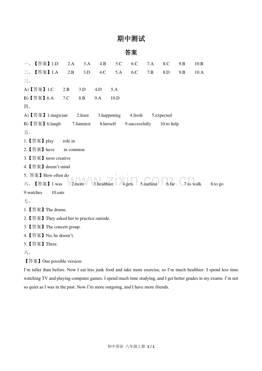 初中英语 八年级上册 1/1 期中期中测试测试 答案答案 一、【答案】1.D 2.A 3.A 4.B 5.C 6.C 7.A 8.C 9.B 10.B 二、【答案】1.A 2.B 3.D 4.C 5.A 6.C 7.B 8.D 9.B 10.A 三、A)【答案】1.C 2.B 3.D 4.D 5.A B)【答案】6.A 7.C 8.B 9.A 10.D 四、A)【答案】1.magician 2.least 3.happening 4.fresh 5.expected B)【答案】6.laugh 7.funniest 8.herself 9.successfully 10.to help 五、1.【答案】play role in 2.【答案】have in common 3.【答案】most creative 4.【答案】doesnt mind 5.答案】How often do 六、【答案】1.was 2.more 3.healthier 4.gets 5.earliest 6.far 7.to walk 8.to go 9.watches 10.eats 七、1.【答案】The drums.2.【答案】They asked her to practice outside.3.【答案】The concert group.4.【答案】No,he doesnt.5.【答案】Three.八、【答案】One possible version:Im taller than before.Now I eat less junk food and take more exercise,so Im much healthier.I spend less time watching TV and playing computer games.I spend much time studying,and I get better grades in my exams.Im not so quiet as I was in the past.Now Im more outgoing,and I have more friends.