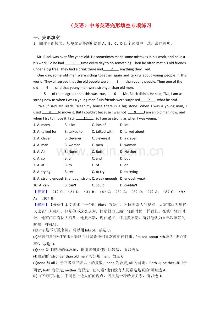 (英语)中考英语完形填空专项练习(英语)中考英语完形填空专项练习一、完形填空一、完形填空1阅读下面短文,从短文后各题所给的A、B、C、D 四个选项中,选出最佳选项。Mr.Black was over fifty years old.He sometimes made some mistakes in his work,and he losthis work.So he had 1 time every day to do something.Then he often met his old friendsunder a big tree.They had a drink there and 2 anything they liked.One day,some old men were sitting together again and talking about young people in thisworld.They all agreed that the old people were 3 than young people.Then one of theold 4 said that young men were stronger than old men.5 of them agreed that this was true,6 Mr.Black didnt.He said,No,I am asstrong now as when I was a young man.His friends were surprised 7 what he said.Well,said Mr Black.Near my house there is a big stone.When I was a young man,Iused 8 to move it.But I couldnt because I was not 9 .I am an old man now,andwhen I try to move it,I still 10 .So I am as strong as when I was young.1.A.many2.A.talked for3.A.clever4.A.man5.A.All6.A.so7.A.at8.A.trying10.A.canA;(10)B;【解析】【分析】本文讲述了一个叫 Black 的先生,不同于常人的观点,大家都认为年轻人比老年人强壮,但是他不这么认为,他觉得自己跟年轻的时候一样强壮。在他年轻的时候,他家门口有块大石头,他搬不动,现在老了,还是搬不动。所以他认为自己跟年轻的时候一样强壮。time 是不可数名词,所以用lots of。故选 C。根据句意“他们在那里喝酒并且谈论他们喜欢做的任何事。”talked about sth.意为“谈论某事”,故选 D。than 是比较级的标志词,说明该句要使用比较级,所以选B。由后面“stronger than old men”可知用 men。故选 Cnone 与 all 用于三者或三者以上的复数;none 为否定,all 为肯定。Both 与 neither 均用于两者,both 为肯定,neither 为否定。由句意“他们没有人同意这是真的”可知选 A。由下句可知他并不同意上边人们的观点,因此是一种转折关系,所以选D。B.a lotB.talked toB.clevererB.womanB.NoneB.orB.toB.tryB.cantC.lots ofC.talked withC.cleverestC.menC.BothC.andC.ofC.to tryC.couldD.lotD.talked aboutD.a cleverD.womenD.NeitherD.butD.onD.to tryingD.couldnt9.A.strong enoughB.enough strongC.weak enough D.enough weak【答案】(1)C;(2)D;(3)B;(4)C;(5)A;(6)D;(7)A;(8)C;(9)be surprised at sb./sth.意为“对感到惊讶”,故选 A。used to do 意为“过去常常做某事”;be used to doing 意为“习惯于做某事”。根据上文“When l was a young man,”可知是过去常常。故选 C。固定句式 be+adj.+enough to do sth.意为“足够怎么样去做”;此句意为“我搬不动它,是因为我不足够强壮”,故选 A。此句意为“当我试图搬动它时,我仍然搬不动(它)。”cant表示“不能”,故选 B。【点评】完型填空考查词汇在篇章中的运用能力,做完型填空首先要跳过空格通读文章掌握其大意,然后细读文章字斟句酌逐一作答,注意考虑句型、语法、搭配、语境等因素。最后通读一遍检查验证。2阅读下面短文,从短文后各题所给的A、B、C、D 四个选项中,选出最佳选项。Never give up!It is my law(法则)of life.It has brought me 1 .I learned the lawfrom my fathers 2 story.My father was 3 in a poor village in the north of Jiangsu,in China.When he was ayoung boy,he went to school in the morning,then 4 in the fields till sunset.And then hedid his homework 5 midnight.Life was hard,because they had no 6 !At the age of 14,my father heard of the United States of America.It was the land of gold,theland where 7 people can become rich.8 dont I go to America?he thought to himself,full of hope.So my father came to America.“I had thought it was easy to 9 money in America,hetold me.But when I arrived there,I realized it was not true.They did not like to hire(雇佣)me because I spoke10English.Later,I worked in a small restaurant,cleaning uptables,11 dishes and sweeping the floor.Life was 12 for the first few years.Iworked from 10 a.m.to 11 p.m.I wanted to go to school to learn English,but it was impossible.Icouldnt 13 the schooling(学费).My father 14 working hard,and reached his goal.Alan,he often says to me.If you want something,you have to work for it and never give up.Things do not come 15 in life.That is what I learned from my father.1.A.disaster2.A.life3.A.famous4.A.taught5.A.until7.A.kind8.A.What9.A.discoverB.lossB.luckyC.successD.pityC.richD.bornD.duringD.moneyD.WhenB.fashionC.dangerD.historyB.workedC.studiedD.sleptB.towards C.forB.poorB.HowB.make6.A.experienceB.energyC.timeC.WhyC.strongD.lazyC.collectD.spend10.A.little11.A.giving13.A.borrow14.A.kept15.A.reallyB.goodC.muchD.excellentD.hardB.running C.washing D.receivingB.needC.affordD.pay12.A.comfortableB.cheerful C.niceB.finished C.minded D.stoppedB.easilyC.quietlyD.slowly【答案】(1)C;(2)A;(3)D;(4)B;(5)A;(6)D;(7)B;(8)C;(9)B;(10)A;(11)C;(12)D;(13)C;(14)A;(15)B;【解析】【分析】这篇短文讲述了我从父亲身上懂得了“永不放弃”这条生活法则。父亲生活在一个贫穷的农场,为了谋求生路,他来到美国。在美国,他一直过着艰苦的生活,但他并没有放弃,最后取得了成功。父亲告诉我如果想要获得成功,就要永不放弃的走下去。考查名词与语境理解。根据前文“Never give up!”It is my law(法则)of my life.“永不放弃”是我的生活法则;得知此句为:它给我带来成功。A 灾难;B 损失;C 成功;D 同情;结合语境故选 C。考查名词与语境理解。根据后文得知,讲述的是父亲的生活故事,此句为:我从父亲的生活故事里学到了这条法则。A 生活;B 时尚;C 危险;D 历史;结合语境故选 A。:考查形容词与语境理解。结合后前后文,此句为:我父亲出生在中国江苏的一个贫困的乡村。A 著名的;B 幸运的;C 富裕的;D 