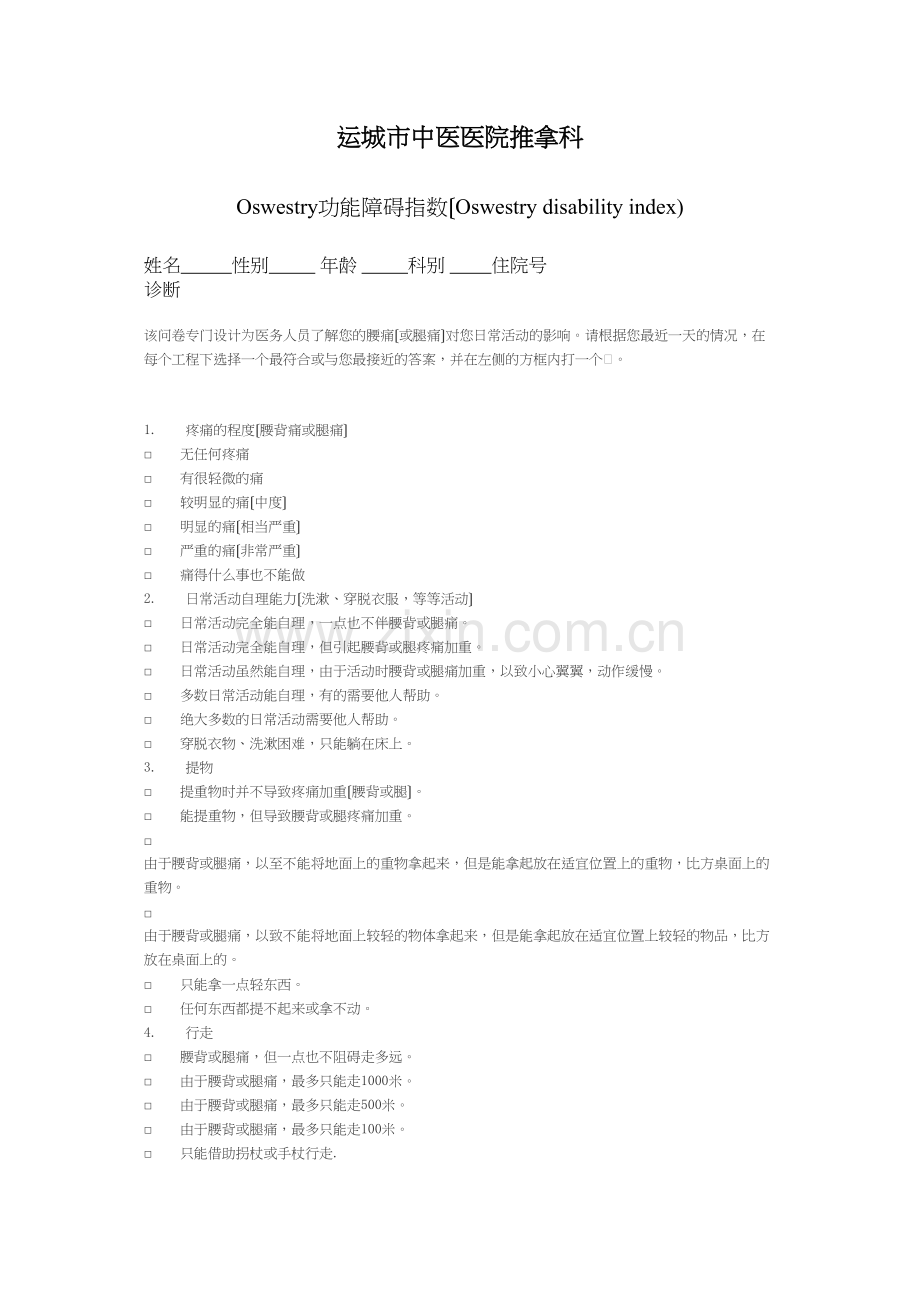 该问卷专门设计为医务人员了解您的腰痛〔或腿痛〕对您日常活动的影响。请根据您最近一天的情况,在每个工程下选择一个最符合或与您最接近的答案,并在左侧的方框内打一个Ö。