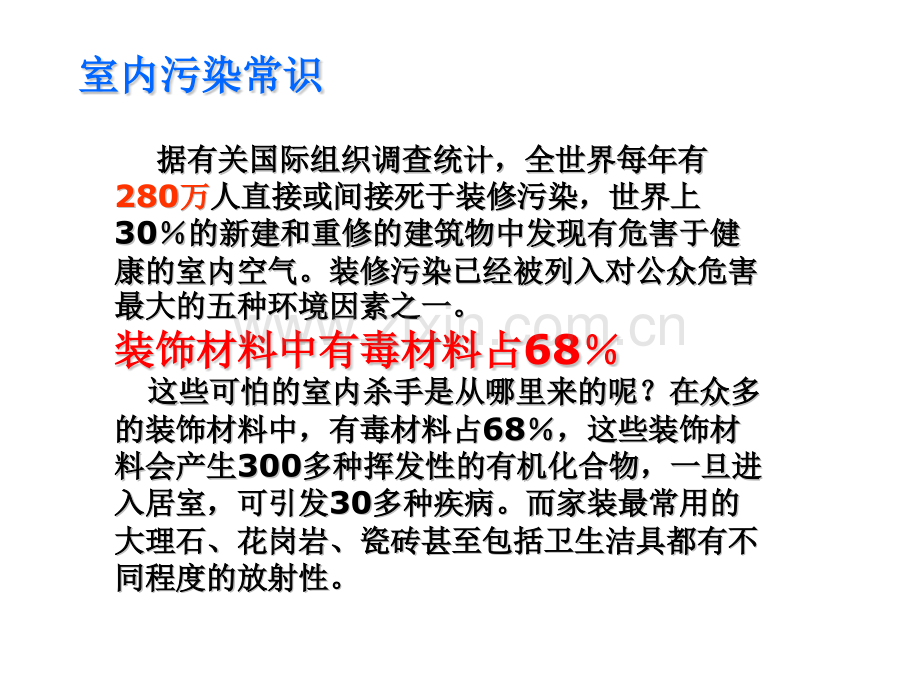 室内污染常识室内污染常识据有关国际组织调查统计,全世界每年有据有关国际组织调查统计,全世界每年有据有关国际组织调查统计,全世界每年有据有关国际组织调查统计,全世界每年有280280万万万万人直接或间接死于装修污染,世界上人直接或间接死于装修污染,世界上人直接或间接死于装修污染,世界上人直接或间接死于装修污染,世界上3030的新建和重修的建筑物中发现有危害于健的新建和重修的建筑物中发现有危害于健的新建和重修的建筑物中发现有危害于健的新建和重修的建筑物中发现有危害于健康的室内空气。装修污染已经被列入对公众危害康的室内空气。装修污染已经被列入对公众危害康的室内空气。装修污染已经被列入对公众危害康的室内空气。装修污染已经被列入对公众危害最大的五种环境因素之一。最大的五种环境因素之一。最大的五种环境因素之一。最大的五种环境因素之一。装饰材料中有毒材料占装饰材料中有毒材料占68 这些可怕的室内杀手是从哪里来的呢?在众多这些可怕的室内杀手是从哪里来的呢?在众多这些可怕的室内杀手是从哪里来的呢?在众多这些可怕的室内杀手是从哪里来的呢?在众多的装饰材料中,有毒材料占的装饰材料中,有毒材料占的装饰材料中,有毒材料占的装饰材料中,有毒材料占6868,这些装饰材,这些装饰材,这些装饰材,这些装饰材料会产生料会产生料会产生料会产生300300多种挥发性的有机化合物,一旦进多种挥发性的有机化合物,一旦进多种挥发性的有机化合物,一旦进多种挥发性的有机化合物,一旦进入居室,可引发入居室,可引发入居室,可引发入居室,可引发3030多种疾病。而家装最常用的多种疾病。而家装最常用的多种疾病。而家装最常用的多种疾病。而家装最常用的大理石、花岗岩、瓷砖甚至包括卫生洁具都有不大理石、花岗岩、瓷砖甚至包括卫生洁具都有不大理石、花岗岩、瓷砖甚至包括卫生洁具都有不大理石、花岗岩、瓷砖甚至包括卫生洁具都有不同程度的放射性。同程度的放射性。同程度的放射性。同程度的放射性。花花花花6969万元买的豪华商务休闲车,车内甲醛超标竟达万元买的豪华商务休闲车,车内甲醛超标竟达万元买的豪华商务休闲车,车内甲醛超标竟达万元买的豪华商务休闲车,车内甲醛超标竟达到到到到2626倍多,消费者卢先生一气之下将汽车经销商告上倍多,消费者卢先生一气之下将汽车经销商告上倍多,消费者卢先生一气之下将汽车经销商告上倍多,消费者卢先生一气之下将汽车经销商告上法庭。法庭。法庭。法庭。原告卢洪祥于原告卢洪祥于原告卢洪祥于原告卢洪祥于20022002年年年年3 3月月月月2323日从北京云龙之星汽日从北京云龙之星汽日从北京云龙之星汽日从北京云龙之星汽车贸易有限公司购买了一辆美国产道奇公羊车贸易有限公司购买了一辆美国产道奇公羊车贸易有限公司购买了一辆美国产道奇公羊车贸易有限公司购买了一辆美国产道奇公羊5 52L2L汽汽汽汽车,价款为车,价款为车,价款为车,价款为6969万元,双方订立了购车合同,卢先生购万元,双方订立了购车合同,卢先生购万元,双方订立了购车合同,卢先生购万元,双方订立了购车合同,卢先生购车后先后支付了各种费用共计车后先后支付了各种费用共计车后先后支付了各种费用共计车后先后支付了各种费用共计6568265682元。同年元。同年元。同年元。同年 8 8月份,月份,月份,月份,卢先生驾车时发觉车内气味刺鼻难忍,头顶开始小片卢先生驾车时发觉车内气味刺鼻难忍,头顶开始小片卢先生驾车时发觉车内气味刺鼻难忍,头顶开始小片卢先生驾车时发觉车内气味刺鼻难忍,头顶开始小片脱发。经检测,车内空气中甲醛含量超出正常值脱发。经检测,车内空气中甲醛含量超出正常值脱发。经检测,车内空气中甲醛含量超出正常值脱发。经检测,车内空气中甲醛含量超出正常值2626倍倍倍倍多。多。多。多。3 3月月月月2929日,朝阳区人民法院依法判决被告北京云龙日,朝阳区人民法院依法判决被告北京云龙日,朝阳区人民法院依法判决被告北京云龙日,朝阳区人民法院依法判决被告北京云龙之星汽车贸易有限公司返还卢先生购车价款、车辆购之星汽车贸易有限公司返还卢先生购车价款、车辆购之星汽车贸易有限公司返还卢先生购车价款、车辆购之星汽车贸易有限公司返还卢先生购车价款、车辆购置费、养路损失费、保险损失费共计置费、养路损失费、保险损失费共计置费、养路损失费、保险损失费共计置费、养路损失费、保险损失费共计751456751456元整。元整。元整。元整。国内首例车内污染案消费者胜诉国内首例车内污染案消费者胜诉序序近近年年来来,许许多多国国家家都都在在耗耗费费巨巨资资治治理理大大气气污污染染,并并已已取取得得一一定定成成效效。但但令令人人不不安安的的是是,现现代代人人在在“煤煤烟烟型型”、“光光化化学学烟烟雾雾型型”污污染染后后,正正在在进进入入以以“室室内内空空气气污污染染”为为标标志志的的第第三三污污染染时时期期。大大量量调调查查资资料料显显示示,室室内内空空气气污污染染程程度度往往往往比比室室外外还高。也就是说室内环境污染比大气污染更严重还高。也就是说室内环境污染比大气污染更严重.中中国国标标准准化化协