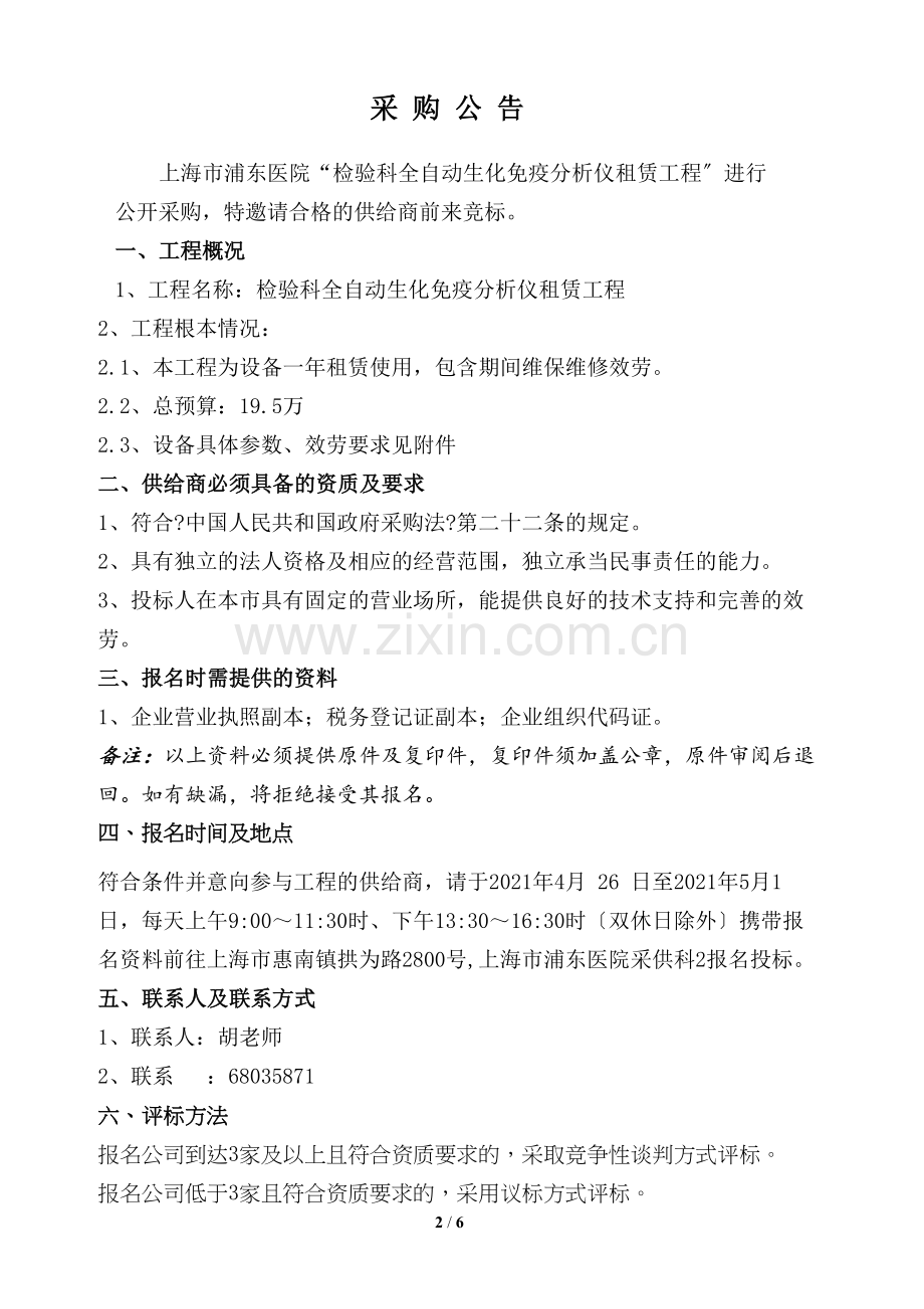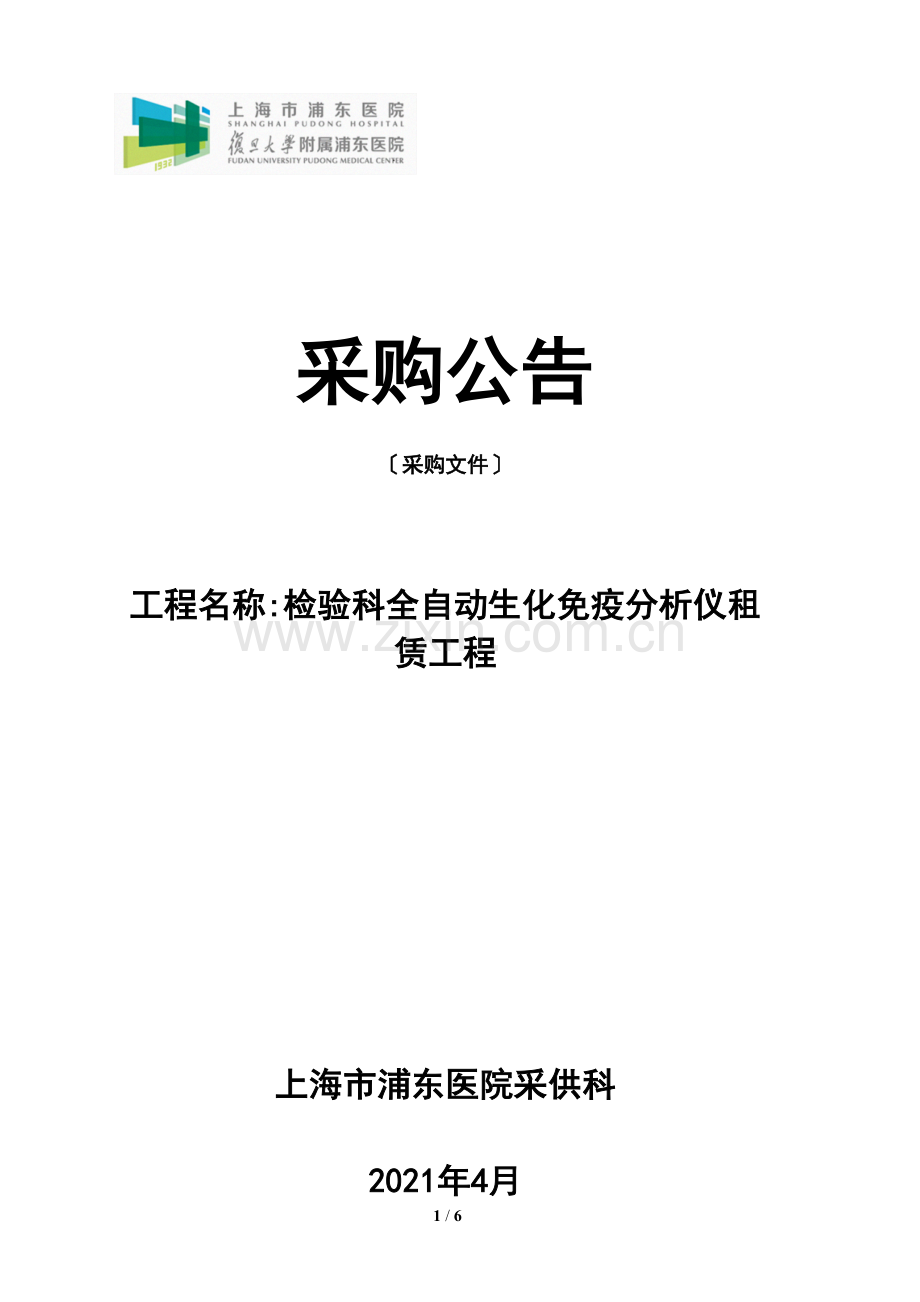 上海市浦东医院“检验科全自动生化免疫分析仪租赁工程〞进行公开采购,特邀请合格的供给商前来竞标
