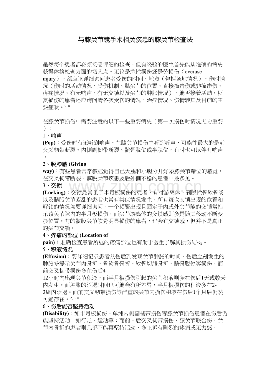 虽然每个患者都必须接受评细的检查,但有经验的医生首先能从准确的病史获得体格检查方面的切入点。无论是急性损伤还是劳损伤(overuse injury),都应该详细询问患者受伤的时间、地点(包括场地情况)、伤时情况(伤时的活动情况、受伤机制、膝关节的位置、直接撞击伤或非撞击伤、疼痛情况、有无响声、有无交锁以及关节的肿胀情况)、能否接着活动,反复损伤的患者还应询问清各次受伤的情况、治疗情况、伤情转归及目前的主要症状。2, 8