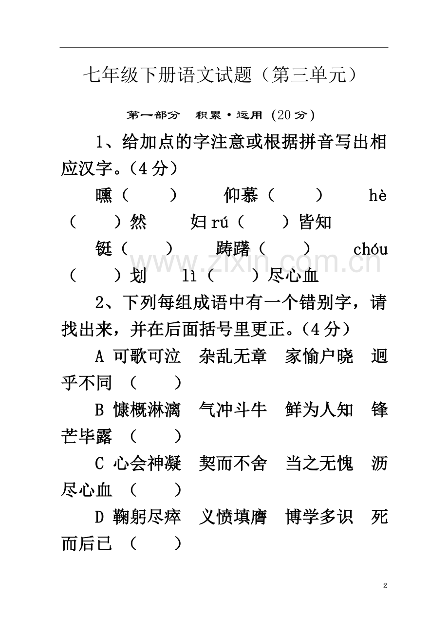 1、给加点的字注意或根据拼音写出相应汉字。(4分)