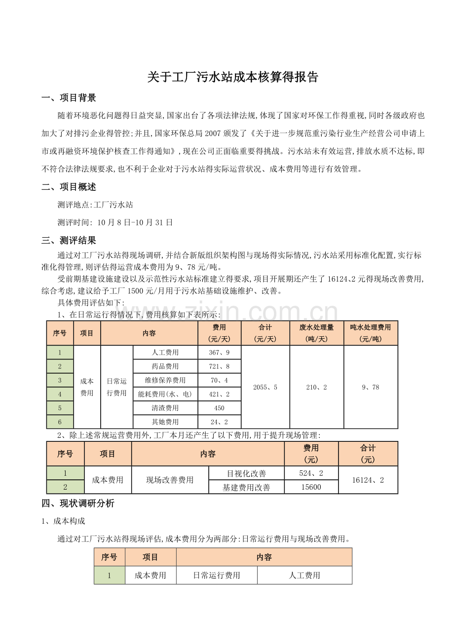 关于工厂污水站成本核算得报告