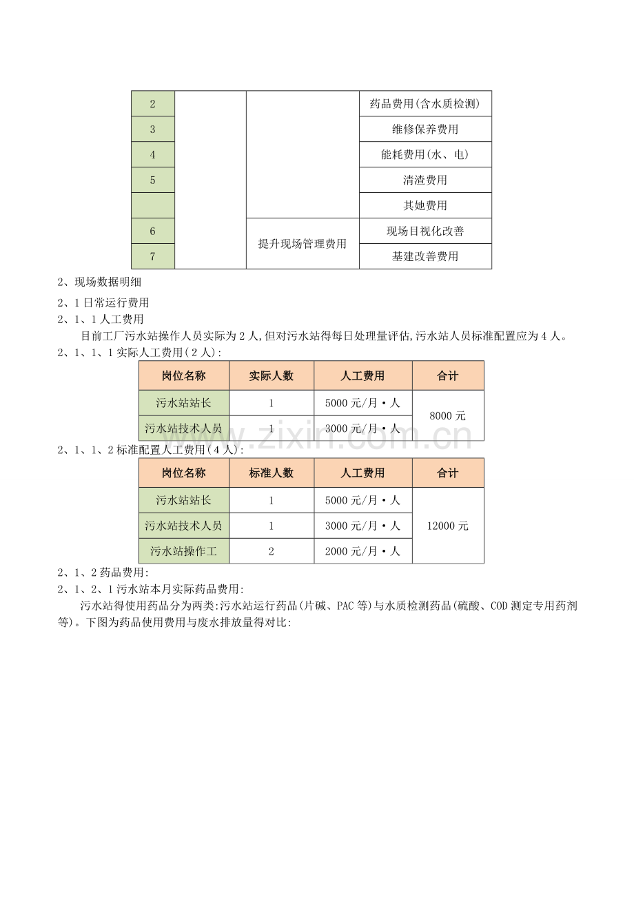 受前期基建设施建设以及示范性污水站标准建立得要求,项目开展期还产生了16124、2元得现场改善费用,综合考虑,建议给予工厂1500元/月用于污水站基础设施维护、改善。