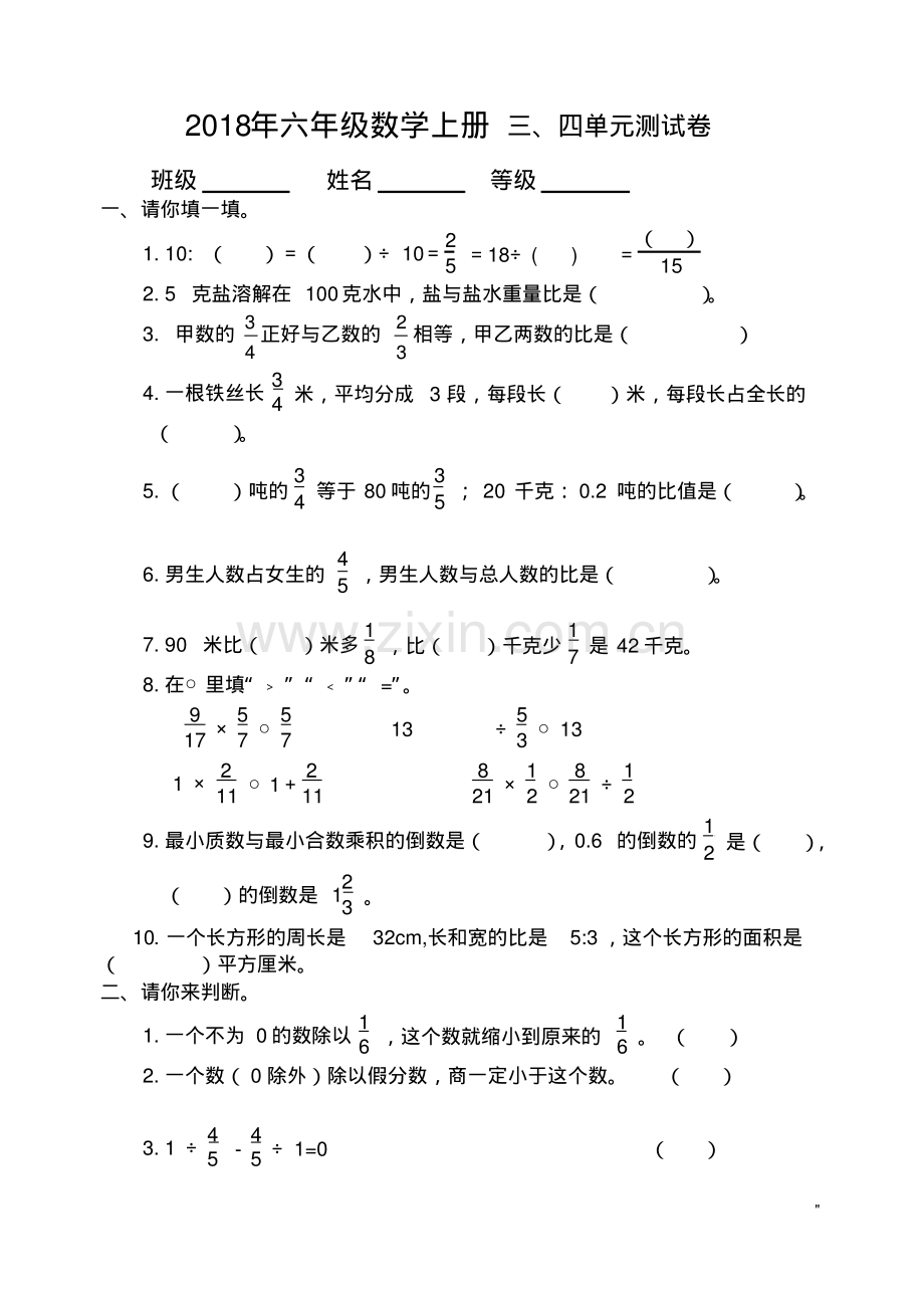 2018年六年级数学上册三、四单元测试卷班级姓名等级一、请你填一填。1.10:()()102518()()152.5 克盐溶解在 100克水中,盐与盐水重量比是()。3.甲数的43正好与乙数的32相等,甲乙两数的比是()4.一根铁丝长34米,平均分成 3 段,每段长()米,每段长占全长的()。5.()吨的34等于 80 吨的35;20 千克:0.2 吨的比值是()。6.男生人数占女生的45,男生人数与总人数的比是()。7.90 米比()米多18,比()千克少17是 42 千克。8.在里填“”“”“=”。9175757 135313 1 211121182112821129.最小质数与最小合数乘积的倒数是(),0.6 的倒数的12是(),()的倒数是 123。10.一个长方形的周长是32cm,长和宽的比是5:3,这个长方形的面积是()平方厘米。二、请你来判断。1.一个不为 0 的数除以16,这个数就缩小到原来的16。()2.一个数(0 除外)除以假分数,商一定小于这个数。()3.1 45451=0 ()4.一项工程,甲单独做用10 天,乙单独做用 8 天,甲、乙两人的工作效率比是 54。()5.哥哥比弟弟高15,弟弟比哥哥矮15。()三、请你选一选。1.下面各算式中,计算结果最大的是()。A.111211 B.111112 C.1111122.甲数的59和乙数的35相等,那么()大。A.甲数B.乙数C.无法比较3.故事书的本数是科技书的25,正确的等量关系式是()A.故事书的本数25=科技书的本数B.科技书的本数25=故事书的本数C.科技书的本数25=故事书的本数4.桃树和梨树棵数比是98,梨树比桃树少()。A.19B.18C.985.3:4 的前项加上 6,要使比值不变,后项应加上()。A.6 B.12 C.8 四、请按要求算一算。1.直接写得数。1413213210915612139594934894 3322.计算下面各题,能简算的要简算。45(3253)391132613 158 65(9731)3.解方程23x=9423 x 14=12 3x75x=274.化简比并求比值。780.2 100千克 0.25 吨五、解决问题。1.这份稿件一共有多少页?2.一辆汽车行驶了25千米用了245L 汽油,平均每千米需要汽油多少升?我已经打了16 页,正好占这份稿件的27