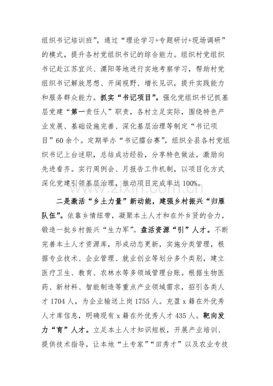二是激活“乡土力量”新动能,建强乡村振兴“归雁队伍”。依靠乡情纽带,凝聚本土人才和在外乡贤的合力,锻造一批乡村振兴“生力军”。盘活资源“引”人才。不断完善本土人才资源库,形成动态更新,实施分类管理,根据专业技术、企业管理、就业创业等划分多个类别,建立医疗卫生、教育、农林水等多领域管理台账。根据生物医药、新材料、智能制造等重点产业领域需求,招引各类人才1704人,为企业输送上岗1755人。充盈x籍在外优秀人才库信息,明确现有x籍在外优秀人才435人。靶向发力“育”人才。立足本土人才知识短板,开展产业培训、提供技术指导,让本地“土专家”“田秀才”以及农业专技人员的技术和“绝活”获得更多发挥空间,全面提升广大农户的农业生产水平,提高本地小香薯、油茶、灵芝等特色农产品的产量和质量。春节期间,针对x籍在外返乡各类人才,针对性组织开展“四个一”系列人才活动,共计开展返乡人才活动30余场,参加人才500余人。定期组织返乡创业人才开办就业创业技能培训班,今年以来累计开展近30次培训,参训人次达2500余人。保障机制“留”人才。拓展延伸保障措施,通过真金白银真正打造平台,解决人才后顾之忧,让人才能心无旁骛干事创业。建立定期联系服务人才工作机制,落实党委联系专家人才和行业主管部门联系服务人才制度,县级领导常态化联系包保、走访慰问专家人才,镇村干部定期联系在外乡贤,了解其发展近况,推介本地招商、项目等相关信息,用“以商招商”的方式实现项目招引。