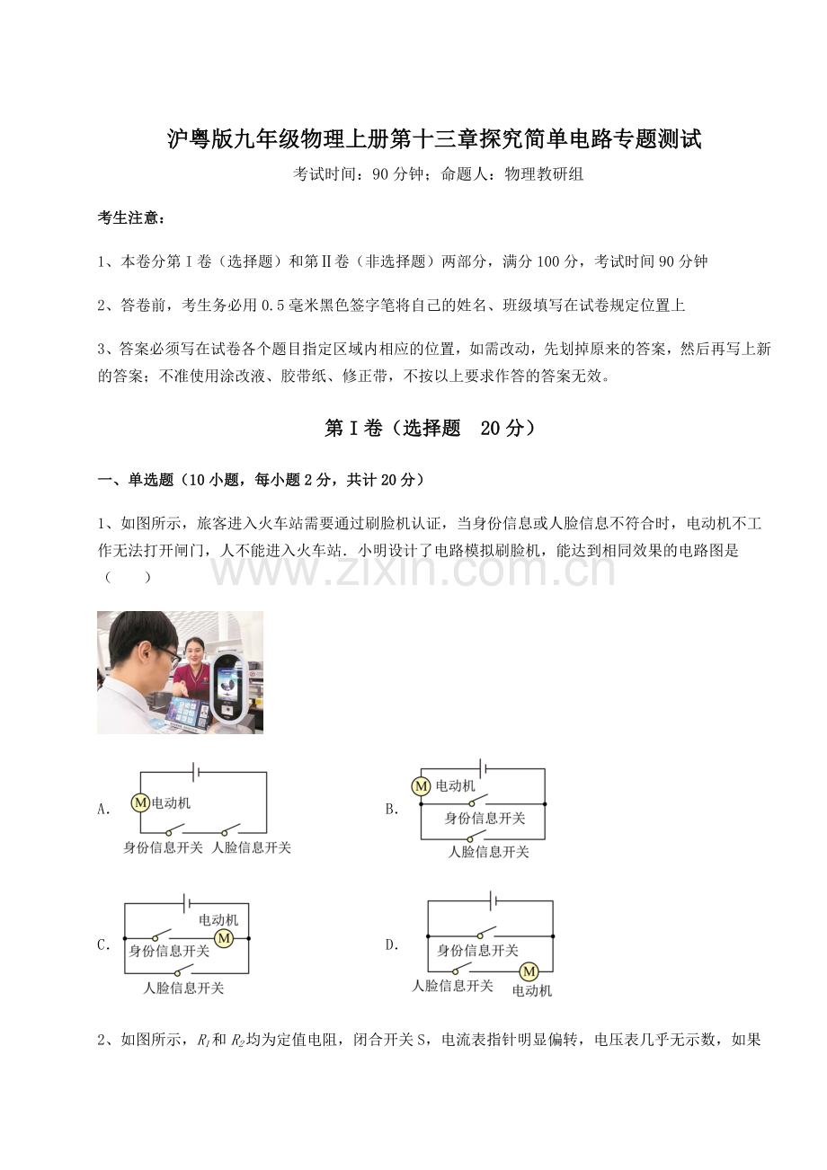 1、如图所示,旅客进入火车站需要通过刷脸机认证,当身份信息或人脸信息不符合时,电动机不工作无法打开闸门,人不能进入火车站.小明设计了电路模拟刷脸机,能达到相同效果的电路图是( )