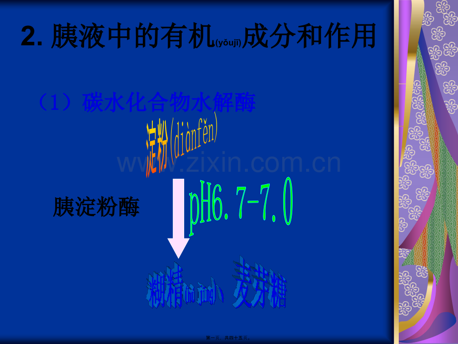 (1 1)碳水化合物水解酶)碳水化合物水解酶2.胰液中的有机胰液中的有机(yuj)成分和作用成分和作用胰淀粉酶胰淀粉酶第一页,共四十五页。胰蛋白酶胰蛋白酶(y dn bi mi)(y dn bi mi)原原 胰蛋白酶胰蛋白酶 糜蛋白酶原糜蛋白酶原糜蛋白酶糜蛋白酶(多肽多肽(du ti)、AA)(2)蛋白质水解酶)蛋白质水解酶羧基羧基(su j)(su j)肽酶原肽酶原羧基肽酶羧基肽酶第二页,共四十五页。胰脂肪酶胰脂肪酶 脂脂肪肪酸酸、甘甘油油(n(n yu)yu)一一酯酯、甘甘油油(n(n yu)yu)(3)脂类水解酶)脂类水解酶第三页,共四十五页。胰蛋白酶胰蛋白酶(y dn bi mi)(y dn bi mi)原(无活性)原(无活性)胰蛋白酶抑制物胰蛋白酶抑制物第四页,共四十五页。(二)胰液分泌(二)胰液分泌(fnm)(fnm)的调节的调节特点特点(tdin)(tdin):酶多酶多而水盐少,而水盐少,占占20%20%条件反射条件反射(tiojin fnsh)(tiojin fnsh)非条件反射非条件反射中枢神经中枢神经迷走神经传出纤维迷走神经传出纤维胰腺胰腺胃窦胃窦胃泌素胃泌素(1 1)头期的胰液分泌)头期的胰液分泌第五页,共四十五页。2.2.胃期胰液胃期胰液(yy)(yy)分泌:分泌:扩张,蛋扩张,蛋白分解产白分解产物物 中枢神经中枢神经迷走神经传出纤维迷走神经传出纤维胰腺胰腺胃体胃体扩张扩张迷走神经传入纤迷走神经传入纤维维胃窦胃窦胃泌素胃泌素5%-10%5%-10%机制机制(jzh)(jzh):特点特点(tdin)(tdin):胰液含酶多而水盐少,胰液含酶多而水盐少,第六页,共四十五页。3.3.肠期胰液肠期胰液(yy)(yy)分泌:分泌:蛋白质蛋白质脂肪脂肪消化产物消化产物特点特点(tdin)(tdin):量多,酶和量多,酶和水盐的含量也水盐的含量也高,高,70%70%第七页,共四十五页。胃泌素胃泌素第八页,共四十五页。1 1)促胰液)促胰液(yy)(yy)素素促水和促水和HCOHCO3 3分泌,酶含量少分泌,酶含量少2 2)胆囊收缩素)胆囊收缩素促胰酶分泌促胰酶分泌(fnm)(fnm);促胆囊收缩;营养胰腺;促胆囊收缩;营养胰腺促酶分泌,水和促酶分泌,水和HCOHCO3 3量少量少胃胃泌泌素素蛋白质分解产物蛋白质分解产物脂肪酸脂肪酸盐酸盐酸(yn sun)(yn sun)脂肪脂肪盐酸盐酸蛋白质分解产物蛋白质分解产物脂酸钠脂酸钠3 3)胃泌素)胃泌素促胰酶分泌促胰酶分泌4 4)血管活性肠肽)血管活性肠肽促水盐分泌促水盐分泌第九页,共四十五页。第十页,共四十五页。胆汁胆汁(dnzh)(dnzh)成分:成分:有机物:胆盐、胆色素、胆固醇、卵磷脂等有机物:胆盐、胆色素、胆固醇、卵磷脂等无机物:水、钠、钾钙等无机物:水、钠、钾钙等 肝肝细胞胞胆囊胆囊(dnn(dnnng)ng)十二指十二指肠(sh(sh rzhchng)rzhchng)肝胆汁肝胆汁胆囊胆汁胆囊胆汁消化期消化期非消化期非消化期金黄色,碱性金黄色,碱性墨墨绿色,酸性色,酸性二、胆汁的分泌与排出二、胆汁的分泌与排出1.1.胆汁的性质和成分胆汁的性质和成分第十一页,共四十五页。1.胆盐胆盐胆汁胆汁(dnzh)酸与甘氨酸或硫酸与甘氨酸或硫磺酸的结合磺酸的结合参与脂肪消化和吸收参与脂肪消化和吸收肠肝循环肠肝循环胆胆盐盐进进入入小小肠肠后后,95%95%以以上上被被回回肠肠末末端端粘粘膜膜吸吸收收,通通过过门门V V又又进进入入肝肝脏脏,再再组组成成胆胆汁汁(dnzh)(dnzh)排排入入肠肠内内,这这个个过过程程称称为为胆胆盐盐的的肠肠肝循环。肝循环。第十二页,共四十五页。2.胆固醇胆固醇脂肪代谢产物脂肪代谢产物与胆汁与胆汁(dnzh)、卵磷脂之、卵磷脂之 间有适当的比例间有适当的比例胆结石(胆固醇结晶)胆结石(胆固醇结晶)3.胆色素胆色素血红蛋白血红蛋白(xuhng dnbi)(xuhng dnbi)的分的分解产物解产物第十三页,共四十五页。(二)胆汁(二)胆汁(dnzh)的作的作用用(1)乳化脂肪)乳化脂肪(zhfng),促脂肪分解促脂肪分解作为作为(zuwi)乳化剂乳化剂降低脂肪表面张力降低脂肪表面张力增加与酶的接触面积增加与酶的接触面积第十四页,共四十五页。(2 2)促进)促进(cjn)(cjn)脂肪吸收脂肪吸收胆盐胆盐 微胶粒微胶粒水溶性混合水溶性混合(hnh)(hnh)微胶粒微胶粒脂肪酸脂肪酸甘油甘油(n yu)一酯一酯胆固醇胆固醇第十五页,共四十五页。中和胃酸中和胃酸刺激肝胆汁刺激肝胆汁(dnzh)分泌分泌防止胆结石形成防止胆结石形成(3 3)促进)促进(cjn)(cjn)脂溶性脂溶性VitVit吸收吸收(4 4)其他)其他(qt)(qt)作用作用第十六页,共四十五页。(三)胆汁的分泌(三)胆汁的分泌(fnm)、排放及其调节、排放及其调节胆囊储存胆汁胆囊储存胆汁高蛋白高蛋白 高脂肪高脂肪 糖类糖类消化期:胆囊收缩消化期:胆囊收缩(shu su)(shu su)、Oddi Oddi括约肌舒张括约肌舒张1.1.胆汁胆汁(dnzh)(dnzh)的分泌和排放的分泌和排放第十七页,共四十五页。2.胆汁胆汁(dnzh)分泌与排放的调节分泌与排放的调节(1 1)神经)神经(shnjng)(shnjng)调节调节迷走神迷走神经经胃泌素胃泌素促胰液素促胰液素肠肠肝循环的胆盐肝循环的胆盐迷走神经迷走神经胃泌素释放胃泌素释放(shfng)进食动作或食物进食动作或食物刺激胃、小肠刺激胃、小肠迷走神经迷走神经肝胆汁分泌肝胆汁分泌胆囊收缩胆囊收缩第十八页,共四十五页。1 1)胆囊)胆囊(dnnng)(dnnng)收缩素收缩素2 2)促胰液素)促胰液素3 3)胃泌素)胃泌素4 4)胆盐)胆盐迷走神经迷走神经胃泌素胃泌素促胰液素促胰液素缩胆囊素缩胆囊素迷走神经迷走神经(2 2)体液)体液(ty)(ty)调节调节胆囊收缩胆囊收缩OddiOddi括约肌舒张括约肌舒张胰酶胰酶胰液分泌胰液分泌肝胆