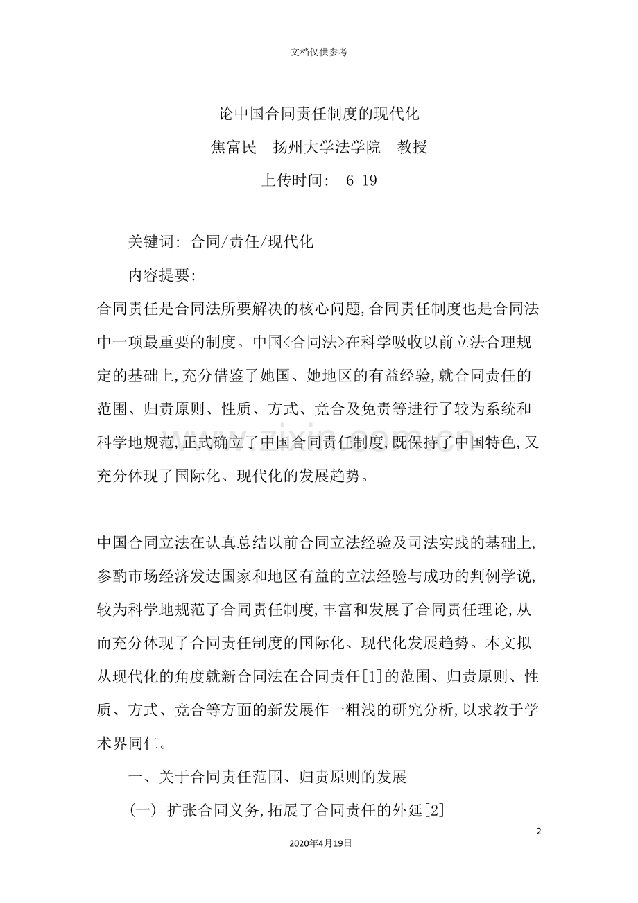 中国合同立法在认真总结以前合同立法经验及司法实践的基础上,参酌市场经济发达国家和地区有益的立法经验与成功的判例学说,较为科学地规范了合同责任制度,丰富和发展了合同责任理论,从而充分体现了合同责任制度的国际化、现代化发展趋势。本文拟从现代化的角度就新合同法在合同责任[1]的范围、归责原则、性质、方式、竞合等方面的新发展作一粗浅的研究分析,以求教于学术界同仁。