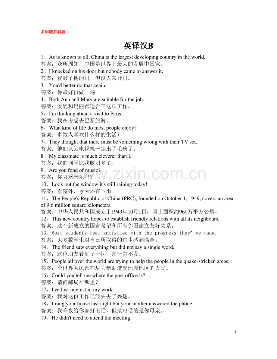 多刷题多刷题多刷题多刷题英译汉英译汉B B1、As is known to all,China is the largest developing country in the world.答案:众所周知,中国是世界上最大的发展中国家。2、I knocked on his door but nobody came to answer it.答案:我敲了他的门,但没人来开门。3、Youd better do that again.答案:你最好再做一遍。4、Both Ann and Mary are suitable for the job.答案:安妮和玛丽都适合干这项工作。5、Im thinking about a visit to Paris.答案:我在考虑去巴黎旅游。6、What kind of life do most people enjoy?答案:多数人喜欢什么样的生活?7、They thought that there must be something wrong with their TV set.答案:他们认为电视机一定出了毛病了。8、My classmate is much cleverer than I.答案:我的同学比我聪明多了。9、Are you fond of music?答案:你喜欢音乐吗?10、Look out the window its still raining today!答案:看窗外,今天还在下雨。11、The Peoples Republic of China(PRC),founded on October 1,1949,covers an areaof 9.6 million square kilometers.答案:中华人民共和国成立于1949年10月1日,国土面积约960万平方公里。12、This new country hopes to establish friendly relations with all its neighbours.答案:这个新成立的国家希望和所有邻国建立友好关系。13、Most students feel satisfied with the progress theyve made.答案:大多数学生对自己所取得的进步感到满意。14、The friend saw everything but did not say a single word.答案:这位朋友看到了一切,却一言不发。15、People all over the world are trying to help the people in the quake-stricken areas.答案:全世界人民都在尽力帮助遭受地震地区的人民。16、Could you tell me where the post office is?答案:请问邮局在哪里?17、Ive lost interest in my work.答案:我对这份工作已经失去了兴趣。18、I rang your house last night but your mother answered the phone.答案:我昨夜给你家打电话,但接电话的是你母亲。19、He didnt need to attend the meeting.1答案:他没必要参加那个会议。20、Life is meaningless without a purpose.答案:没有目标的生活是毫无意义的。21、I hope we can have some snow this winter.答案:我希望今年冬天会下点雪。22、This box can hold more books than that one.答案:这个箱子比那个箱子能装更多的书。23、Our textbooks are very different from theirs.答案:我们的教材与他们的教材很不一样。24、You and your team can discover the answers to problems together.答案:你和你的团队能够一起找到问题的答案。25、I read the local newspapers with great interest every evening.答案:每晚我怀着极大的兴趣读当地报纸。26、Do you think you can do it by yourself?答案:你认为你自己可以单独干完这件事吗?27、I slept soundly all night.答案:我整夜睡得很熟。28、Playing the sport you like is an important part of a persons life.答案:进行一项自己喜欢的运动是一个人生活中重要的一部分。29、The teacher came earlier than expected(预期).答案:老师来得比预期的早。30、I have no idea what to say.答案:我不知道说什么好。31、Jim was clever,but he does not work hard.答案:吉姆很聪明,但他讨厌吃苦。32、Whos going to answer the telephone?答案:谁去接电话?33、Your composition is well written,but theres still some room for improvement.答案:你的作文很不错,但是还有改进的余地。34、These two students from our school have been admitted to Beijing University.答案:我们学校这两个学生已经被北京大学录取了。35、Im sure well have a good time.答案:我相信我们会很开心的。36、We should adapt ourselves to the new surroundings.答案:我们应当使自己适应新的环境。237、He doesnt like the way you talk to him.答案:他不喜欢你和他说话的样子。38、Only those who work hard will be in a better position in the competition.答案:只有勤奋者才会在这场竞争中处于更为有利的地位。39、I look forward to hearing from you.答案:我期待着收到您的回信。40、In the past few days,news of victory has kept coming in.答案:在过去的几天里胜利的消息不断传来。41、This is the worst hospital I have ever seen.答案:这是我见过的最差的医院。42、That team withdrew from the match as a protest against the unfair referee.答案:那个球队退出了比赛,抗议那个不公平的裁判。43、She likes Mike a lot,but she doesnt want to get married so early.答案:她喜欢迈克,但她不想那么早就结婚。44、The girls are busy making preparations for the weekend party.答案:姑娘们忙着准备周末的晚会。45、You can buy water inside.答案:你可以在里面买水喝。46、He keeps looking at himself in the mirror.答案:他老是照镜子。47、Jane moved to New York at the end of last month.答案:简在上月底就移居纽约了。48、This is the most wonderful day of my life,because Im here with you now.答案:今天是我一生中最美好的一天,因为我现在和你在一起。49、He has the habit of making notes while reading.答案:他有阅读时记笔记的习惯50、Its always a pleasure to see many friends here in London.答案:很高兴在伦敦见到许多朋友。51、The doctor is very patient with his patients.答案:医生对他的病人很耐心。52、Dont you mind my opening the window?答案:你不介意我打开窗户吧?53、The earth on which we live is shaped like a ball.答案:我们居住的地球,形状像一个大球。54、Please call me back when you are free.答案:你有时间给我回个电话。55、People use science knowledge to understand and change nature.答案:人们利用科学知识去了解自然,改造自然。56、I think our dream will become true.3答案:我认为我们的梦想将成为现实。57、We are getting ready for our English examination.答案:我们正在为英