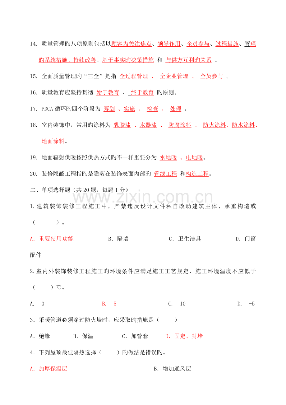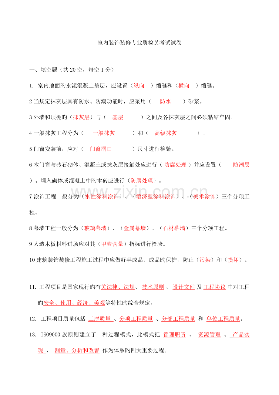 室内装饰装修专业质检员考试试卷