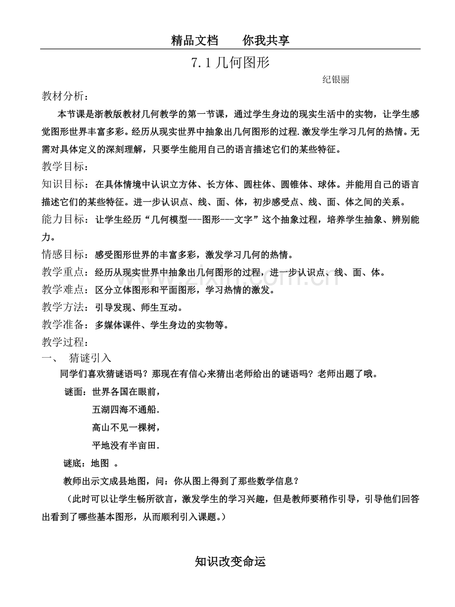 本节课是浙教版教材几何教学的第一节课,通过学生身边的现实生活中的实物,让学生感觉图形世界丰富多彩。经历从现实世界中抽象出几何图形的过程.激发学生学习几何的热情。无需对具体定义的深刻理解,只要学生能用自己的语言描述它们的某些特征。