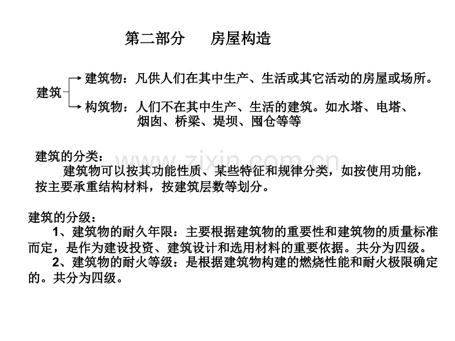 建筑建筑第二部分第二部分 房屋构造房屋构造建筑物:凡供人们在其中生产、生活或其它活动的房屋或场所。建筑物:凡供人们在其中生产、生活或其它活动的房屋或场所。建筑的分类:建筑的分类:建筑物可以按其功能性质、某些特征和规律分类,如按使用功能,建筑物可以按其功能性质、某些特征和规律分类,如按使用功能,按主要承重结构材料,按建筑层数等划分。按主要承重结构材料,按建筑层数等划分。构筑物:人们不在其中生产、生活的建筑。如水塔、电塔、构筑物:人们不在其中生产、生活的建筑。如水塔、电塔、烟囱、桥梁、堤坝、囤仓等等烟囱、桥梁、堤坝、囤仓等等建筑的分级:建筑的分级:1、建筑物的耐久年限:主要根据建筑物的重要性和建筑物的质量标准、建筑物的耐久年限:主要根据建筑物的重要性和建筑物的质量标准而定,是作为建设投资、建筑设计和选用材料的重要依据。共分为四级。而定,是作为建设投资、建筑设计和选用材料的重要依据。共分为四级。2、建筑物的耐火等级:是根据建筑物构建的燃烧性能和耐火极限确定、建筑物的耐火等级:是根据建筑物构建的燃烧性能和耐火极限确定的。共分为四级。的。共分为四级。建建筑筑物物的的分分类类按使用功能分按使用功能分民用建筑民用建筑按层数分按层数分居住建筑:居住建筑:住宅、公寓、宿舍等。住宅、公寓、宿舍等。公共建筑:公共建筑:行政办公楼、文教建筑行政办公楼、文教建筑.工业建筑:工业建筑:主要生产厂房、辅助生产厂房主要生产厂房、辅助生产厂房农业建筑:农业建筑:温室、粮仓、畜禽饲养场温室、粮仓、畜禽饲养场.按主要承重按主要承重结构材料分结构材料分砖木结构砖木结构砖混结构砖混结构钢筋砼结构钢筋砼结构钢、钢筋砼结构钢、钢筋砼结构钢结构钢结构其它结构其它结构住宅建筑:住宅建筑:低层低层1-3;多层;多层4-6;中高层;中高层7-9;高层;高层10-30。公共建筑及综合性建筑的总高度公共建筑及综合性建筑的总高度24m24m者为高层。者为高层。建筑物高度建筑物高度100m100m时,不论住宅或公共建筑均为超高层。时,不论住宅或公共建筑均为超高层。工业建筑(厂房):工业建筑(厂房):单层厂房、多层厂房、混合层数厂房。单层厂房、多层厂房、混合层数厂房。一、民用建筑的基本构件及其作用一、民用建筑的基本构件及其作用一般民用建筑是由一般民用建筑是由基础、墙和柱、楼板、屋顶、楼梯和门窗基础、墙和柱、楼板、屋顶、楼梯和门窗等组成等组成。基础基础基础基础:是指房屋下部埋在土中的承重构件。承受和传递荷载是指房屋下部埋在土中的承重构件。承受和传递荷载。墙体墙体墙体墙体:承重、围护、分隔承重、围护、分隔。楼板楼板楼板楼板:可分隔楼层空间。承受和传递荷载可分隔楼层空间。承受和传递荷载。屋顶屋顶屋顶屋顶:承重、围护承重、围护。楼梯楼梯楼梯楼梯:是联系上下楼层的垂直交通设施是联系上下楼层的垂直交通设施。门窗门窗门窗门窗:门主要用做交通联系,兼采光、通风门主要用做交通联系,兼采光、通风。窗主要用做采光、通风和眺望窗主要用做采光、通风和眺望。二、基础构造二、基础构造(一)基础与地基(一)基础与地基 1、基础:基础:将结构所承受的各种作用传到地基上的结构组成部分称为基础。将结构所承受的各种作用传到地基上的结构组成部分称为基础。基础是房屋建筑的重要组成部分,它承受建筑物上部结构传来的基础是房屋建筑的重要组成部分,它承受建筑物上部结构传来的 全部荷载,并将这些荷载连同自身重量一起传到地基。全部荷载,并将这些荷载连同自身重量一起传到地基。2、地基:地基:为支承基础上的土体或岩体称为地基。为支承基础上的土体或岩体称为地基。地基不属于建筑物的组成部分,但它对保证建筑物的坚固耐久具有非常重要地基不属于建筑物的组成部分,但它对保证建筑物的坚固耐久具有非常重要的作用。的作用。3、基础与地基的关系基础与地基的关系:基础的类型与构造并不完全决定于建筑物上部结构,它与地基土的性质有着密基础的类型与构造并不完全决定于建筑物上部结构,它与地基土的性质有着密切关系。具有同样上部结构的建筑物建造在不同的地基上,其基础的形式与构造切关系。具有同样上部结构的建筑物建造在不同的地基上,其基础的形式与构造可能是完全不同的。因此,地基与基础之间,有着相互影响,相互制约的密切关可能是完全不同的。因此,地基与基础之间,有着相互影响,相互制约的密切关系。系。(二)基础的埋置深度及影响因素(二)基础的埋置深度及影响因素 1、基础的埋置深度基础的埋置深度:一般自室外设计地面标高至基础底部一般自室外设计地面标高至基础底部的垂直高度称为基础的埋置深度,简称的垂直高度称为基础的埋置深度,简称埋深。埋深。基础底面标高基础放脚基础埋置深度室内外高差室外地面地坪防潮层室内地坪2、影响基础埋深的因素影响基础埋深的因素(1)建筑物的用途及基础构造的影响建筑物的用途及基础构造的影响(2)作用在地基上的荷载大小和性质的影响作用在地基上的荷载大小和性质的影响(3)工程地质和水文地质条件的影响工程地质和水文地质条件的影响(4)地基土冻胀和融陷的影响地基土