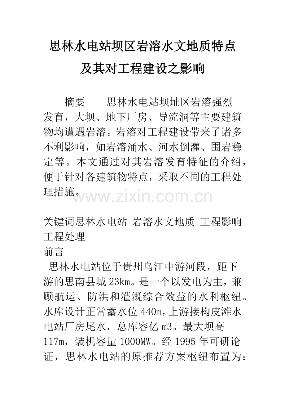 关键词思林水电站 岩溶水文地质 工程影响 工程处理