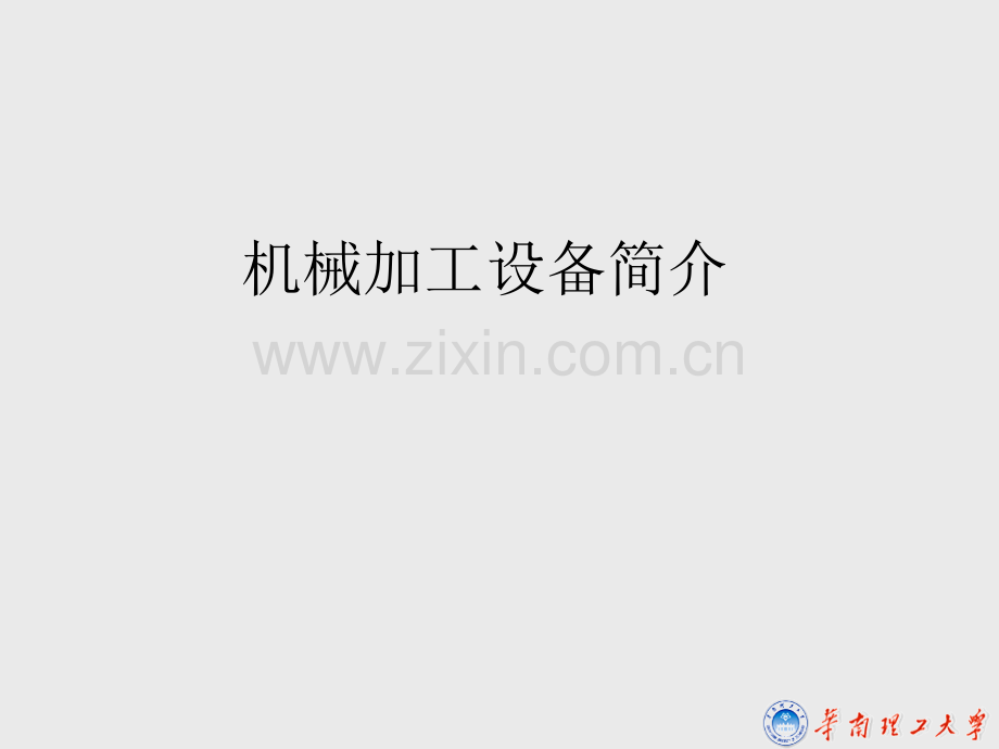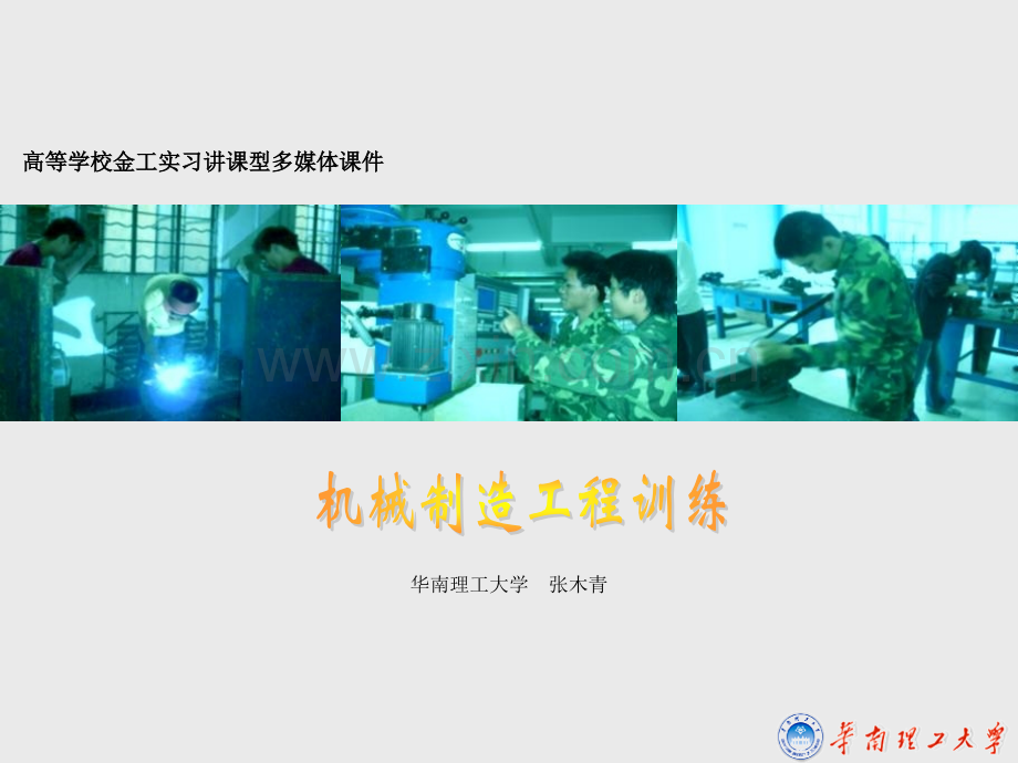 华南理工大学 张木青高等学校金工实习讲课型多媒体课件高等学校金工实习讲课型多媒体课件 机械加工设备简介第一节第一节 金属切削机床金属切削机床 机床按其工作原理、结构特点及使用范围,划分为12类,其中磨床类又分为3个小类。一、机床的分类一、机床的分类金属切削机床分类及代号金属切削机床分类及代号二、普通机床的型号、运动及加工二、普通机床的型号、运动及加工C6132:C表示车床类;6表示卧式车床组;1表示卧式车床系;32表示床身上最大工件回转直径的1/10,即320mm。(一)车床(一)车床1、车床型、车床型号与结构号与结构变速箱 变速箱用来改变主轴的转速。可使主轴获得12种不同的速度。主轴箱用来支承主轴,并使其作各种速度旋转运动。主轴前端圆锥面安装卡盘和拨盘,以便装夹工件 进给箱 进给箱用来改变进给量。溜板箱 溜板箱用来使光杠和丝杠的转动改变为刀架的自动进给运动 刀架 刀架用来夹持车刀并使其作纵向、横向或斜向进给运动 刀架视频尾架 尾架用于安装后顶尖以支持工件,或安装钻头、铰刀等刀具进行孔加工。尾座的结构如图所示 2、车床运动 进给运动:刀具纵向、横向、斜向的移动。主运动:工件的旋转运动。3、车床加工范围、车床加工范围车床加工范围:车床加工范围:外圆、内圆、平面、锥面、螺纹、回转沟槽、回转成形面、滚花面及切断等。4、车削尺寸公差等级及、车削尺寸公差等级及Ra值值(二)钻床(二)钻床1、钻床型号、钻床型号1)台钻Z4012:Z表示钻床类;4表示台式钻床组;0表示 台式钻床系;12表示最大钻孔直径,即12mm。2)立钻Z5125:Z表示钻床类;5表示立式钻床组;1表示 立式钻床系;25表示最大钻孔直径,即25mm。1工作台 2进给手柄 3主轴4带罩 5电动机 6主轴架7立柱 8机座1工作台 2主轴3进给箱 4主轴变速箱 5电动机 6立柱 7进给手柄 8机座3)摇臂钻床摇臂钻床有一个能绕立柱旋转的摇臂。主轴箱可在摇臂上作横向移动,并可随摇臂沿立柱上下作调整运动,因此,操作时能很方便地调整到需钻削的孔的中心,而工件不需移动。摇臂钻床加工范围广,可用来钻削大型工件的各种螺钉孔、螺纹底孔和油孔等。摇臂钻床1立柱 2主轴箱 3摇臂 4主轴 5工作台 6机座 摇臂钻Z304016:Z表示钻床类;3表示摇臂钻床组;0表示摇臂钻床系;40表示最大钻孔直径,即40mm;16表示最大跨距的1/100,即1600mm。2、钻床切削运动、钻床切削运动 进给运动:刀具的轴向移动钻孔、扩孔、铰孔、锪孔、锪平面、攻螺纹等。用扩孔钻对已钻出的孔作扩大加工称为扩孔。扩孔所用的刀具是扩孔钻,如图所示。扩孔可作为终加工,也可作为铰孔前的预加工。3、钻床加工范围、钻床加工范围 主运动:刀具的旋转运动锪孔 在孔口表面用锪钻加工出一定形状的孔或凸台的平面,称为锪孔。例如,锪圆柱形埋头孔、锪圆锥形埋头孔、锪用于安放垫圈用的凸台平面等。铰孔 铰孔是孔的精加工。铰孔可分粗铰和精铰。精铰如图所示,其加工余量较小,只有005015mm,铰孔前工件应经过钻孔一扩(或镗孔)等加工 4、钻削尺寸公差等级及、钻削尺寸公差等级及Ra值值(三)铣镗床(三)铣镗床 T6180:T表示镗床类;6表示卧式镗床组;1表示卧式铣镗床系;80表示主轴直径80mm。2、铣镗床切削运动、铣镗床切削运动 1、铣镗床型号、铣镗床型号 主运动:刀具的旋转运动(由主轴或平旋盘带动)进给运动:工作台带动工件的纵向、横向移动,或主轴箱带动刀具垂向移动,或主轴带动刀具轴向移动,或平旋盘径向刀架带动刀具径向移动3、铣镗床加工范围、铣镗床加工范围 钻孔、扩孔、铰孔、镗孔。镗内槽、车外圆、车端面、铣平面、铣沟槽等。4、镗削尺寸公差等级及、镗削尺寸公差等级及Ra值值(四)铣床(四)铣床 X6125:X表示铣床类;6表示卧式铣床组;1表示万能升降台铣床系;25表示工作台宽度的1/10,即250mm。2、铣床切削运动、铣床切削运动 1、铣床型号、铣床型号 X5030:X表示铣床类;5表示立式铣床组;0表示立式升降台铣床系;30表示工作台宽度的1/10,即300mm。进给运动:工件的纵向、横向、垂向移动。主运动:刀具的旋转运动3、铣床加工范围、铣床加工范围 平面(水平面、垂直面、斜面)、沟槽(直角槽、T形槽、V形槽、燕尾槽、圆弧槽、螺旋槽)、成形面、分度件及孔加工(钻孔、扩孔、铰孔、铣孔)等。4、铣削尺寸公差等级及、铣削尺寸公差等级及Ra值值(五)刨床和插床(五)刨床和插床1、刨床和插床型号、刨床和插床型号 B6050:B表示刨床类;6表示牛头刨床组;0表示牛头刨床 系;50表示刨削工件最大长度的1/10,即500mm。B2010A:B表示刨床类;2表示龙门刨床组;0表示龙门刨 床系;10表示最大刨削宽度的1/100,即1000mm;A表示经 过一次重大改进。B5020:B表示刨床类;5表示插床组;0表示插床系;20表 示最大插削长度的1/10,即200mm。2、刨床和插床切削运动、刨床和插床切削运动 进给运动:工件的间歇直线移动。进给运动:刀具的间歇直线移动。A 牛头刨床牛头刨床(刨水平面时刨水平面时)切削运动切削运动 主运动:刀具的直线往复运动。B 龙门刨床切削运动龙门刨床切削运动 主运动:工件的直线往复运动。C 插床切削运动插床切削运动 主运动:刀具的垂向直线往复运动。进给运动:工件的纵向、横向、周向间歇移动。3、刨床和插床加工范围刨床和插床加工范围平面(水平面、垂直面、斜面)、沟槽(直角槽、T形槽、V形槽、燕尾槽)及