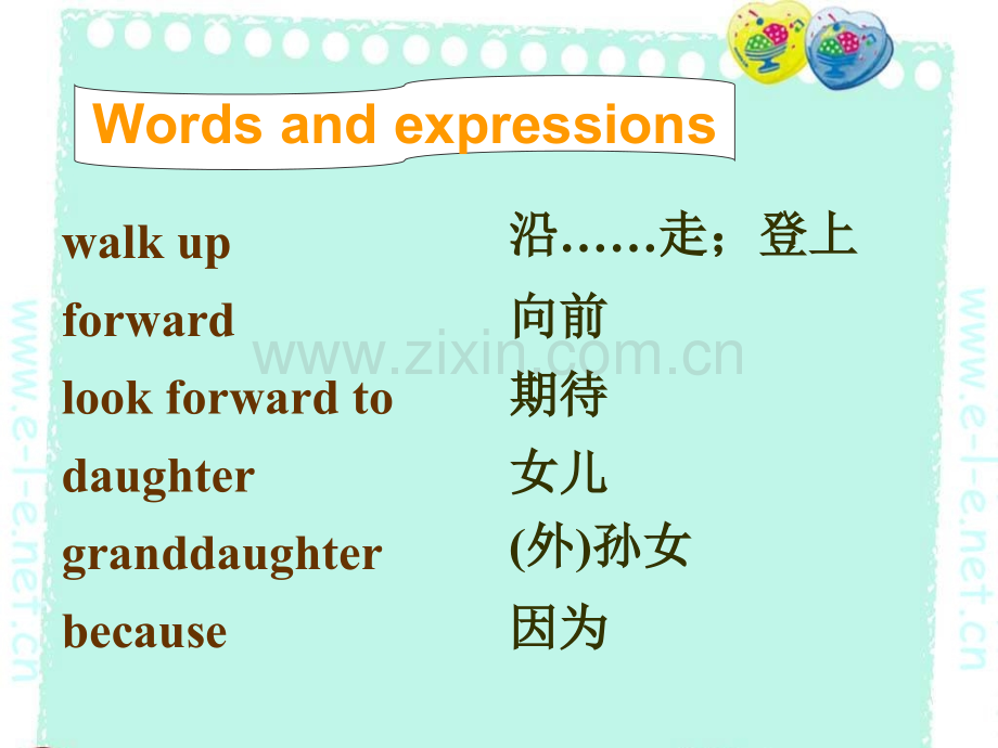 Were going to walk up the Great Wall.walk upforwardlook forward todaughtergranddaughterbecauseWords and expressions沿沿走;登上走;登上向前向前期待期待女儿女儿(外外)孙女孙女因为因为planesightseeingdo some sightseeingculturebeachseaWords and expressions飞机飞机游览;观光游览;观光游览游览文化文化海滨;海滩海滨;海滩海;海洋海;海洋wifecookwhyforeignget(from)togo sightseeingWords and expressions计划;打算计划;打算温习;复习温习;复习温习;复习温习;复习野餐野餐吃野餐吃野餐去观光去观光Discuss:What are you looking forward to?你正期待着什么?你正期待着什么?*look forward to+n./v-ing 期待某事期待某事/期待做某事期待做某事Im looking forward to getting lots of money.the Great WallIm looking forward to visiting the Great Wall with my parents.Im look forward to visiting the Forbidden City.DisneylandIm looking forward to visiting Disneyland because I like Mickey Mouse.Mickey Mouse and Donaldlie on the beach and enjoy the sun and the seaWere looking forward to the Dragon Boat Festival.the Dragon Boat FestivalHong Kong 香港香港San Francisco 旧金山旧金山Im looking forward to visiting San Francisco because I want to make some American friends.Activity 1 Listen and try to catch some famous places.Read the passages and try to answer Activity2A.Helen is looking forward to seeing her daughter and granddaughter.B.Lucy is looking forward to going to Disneyland.C.Li is looking forward to the Dragon Boat Festival.Listen again and match them with the photos.B Lucy,Nanjing A Helen,New York C Li,WuhanPart3 Match the questions with the answers.1 Why is Helen going to visit her granddaughter?c Because its her birthday.2 Why are they going to do some sightseeing?e Because they like Chinese culture.3 Why is Lucy going to Disneyland?a Because she likes Mickey Mouse.4 Why is she going to lie on the beach?b Because she likes the sun and the sea.5 Why is Li going to watch the Dragon Boat Festival in Hong Kong?f Because his parents live there.6 Why are they going to enjoy his mothers zongzi?d Because shes a very good cook.do some sightseeing enjoy the sun and the seaLike foreign culture stay in a hotel take the planeAnswer the questions.Use the words1 How do you get from New York to Beijing?2 What do you do in a foreign city?3 What do you do on the beach?4 Where do you stay in a foreign city?5 Why do you go sightseeing?Because I like foreign culture.writingPart 5 Write full answers.Use because.1.Why is Lucy going to learn English?Lucys going to learn English because she wants to make some American friends.2.Why are Lucy and her parents going to stay in a hotel in San Francisco?Lucy and her parents are going to stay in a hotel in San Francisco because her parents have some friends there.3.Why are Li and his wife going to lie on the beach?Li and his wife are going to lie on the beach because their children like swimming.Three or four students in a group talk about what youre looking forward to,what you are going to do and tell why.Then choose one students to give a report in front of the class.Use the following questions.1 What are you looking forward to?2 What are you going to do?3 Why are you going to do it?Report like this:Betty is looking forward to going out on Saturday evening.Shes going to go to the cinema because she likes films.Useful Phrases1.look forward to+n./v-ing 期待某事期待某事/期待做某事期待做某事-He is looking forward to the Dragon Boat Festival.-We are looking forward to visiting Hong Kong.-I am looking forward to your coming.2.Im going to take the plane to Beijing because they live there.*take a/the plane to=go toby plane/on a plane-They take a/the plane to Beijing.=They go to Beijing by plane/on a plane.*because 因为因为 (回答做某事的原因回答做某事的原因,即即why 的特殊疑问句的特殊疑问句)-Why are you late?Because my bike is broken.3.do some sightseeing=go sightseeing 观光游览观光游览类似结构:类似结构:-do some reading -do some shopping-do some washing -do some cleaning-do some cooking4.like Chinese cultureforeign culture 外国文化外国文化 foreigner 外国人外国人-They come from foreign countries but they like Chinese culture.喜欢中国的文化喜欢中国的文化6.want to make some American friends想要交些美国朋友想要交些美国朋友*make friends(with sb)和某人交朋友和某人交朋友-Its my pleasure to make friends with you.5.walk up the Great Wall*walk up 沿沿.走;登上走;登上 *walk down沿沿.走走;向下走向下走-Walk up the road to the end and you can see the hospital.登上长城登上长城7.lie on the beach and enjoy the sun and the sea.8.stay in a hotel躺在海滩上享受阳光和海水躺在海滩上享受阳光和海水呆呆/住在宾馆住在宾馆9.get from New York to Beijing*get to.到达到达.*get from.to.从从到达到达.从纽约到达北京从纽约到达北京-He often gets to school at 7:00 in the morning.-She gets home at about 7:00 every day.-They get from Shanghai to Beijing by plane例如:例如:Choose the best answer1 Mary is going to_ her email this evening.A check B look C watch D see2 Tom is looking forward to _ the new film.A see B to see C seeing D sees3 My father is going to _ a plane to Wuhan tomorrow.A ask B take C get D sit4 They have never been to Beijing.Theyre going there to _.A go shopping B go fishing C go sightseeing D go cycling5 Im going to_some music this evening.A listen B see C listen to D hearTranslate the sentences into English1 我正盼望着参观长城。我正盼望着参观长城。2 他爸爸是一位厨师。他正在做饭。他爸爸是一位厨师。他正在做饭。Im looking forward to visiting the Great Wall.His father is a cook.He is cooking the meal.5 他们打算复习功课准备考试。然他们打算复习功课准备考试。然后他们打算检查眼睛。后他们打算检查眼睛。They a