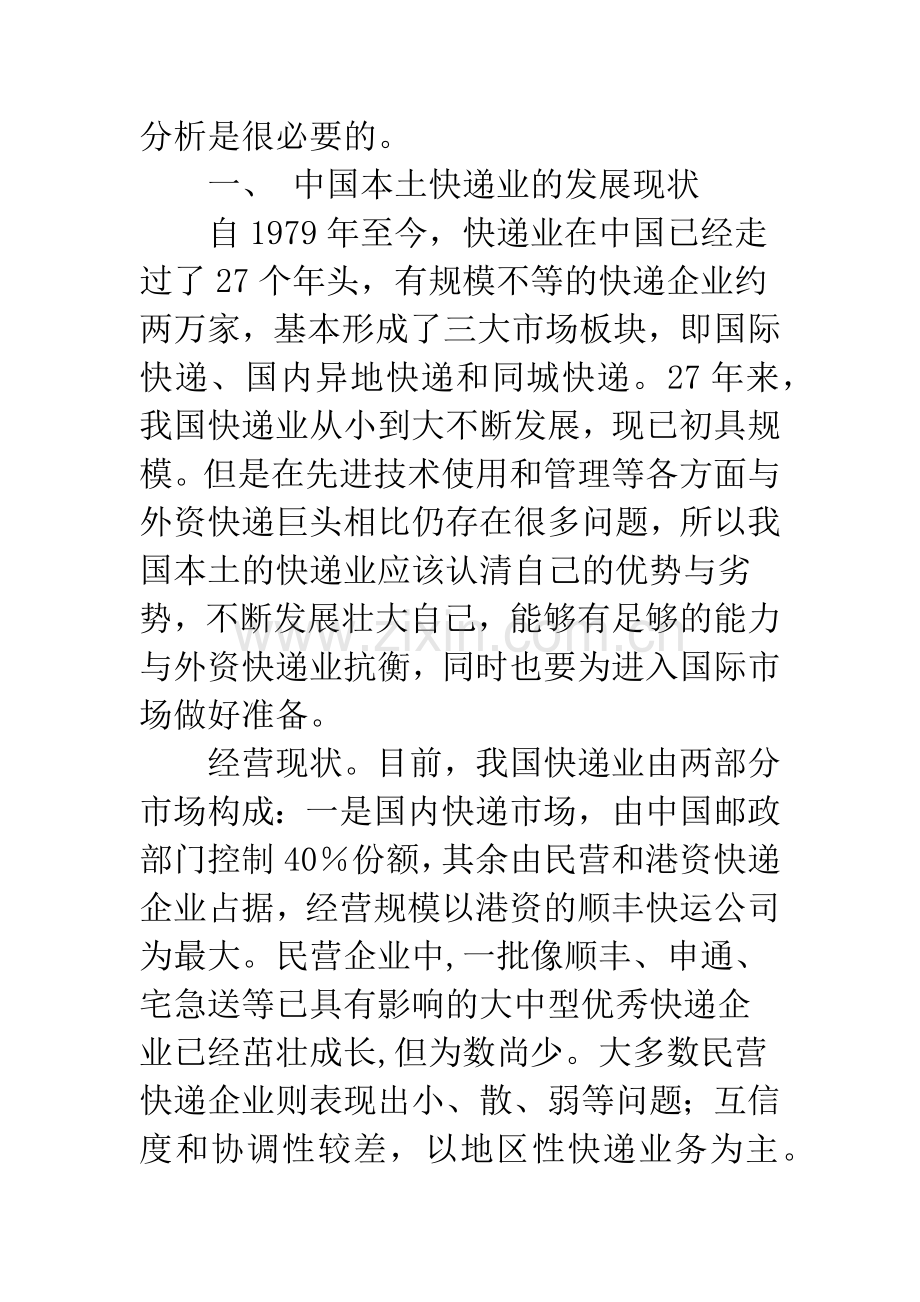 自1979年至今,快递业在中国已经走过了27个年头,有规模不等的快递企业约两万家,基本形成了三大市场板块,即国际快递、国内异地快递和同城快递。27年来,我国快递业从小到大不断发展,现已初具规模。但是在先进技术使用和管理等各方面与外资快递巨头相比仍存在很多问题,所以我国本土的快递业应该认清自己的优势与劣势,不断发展壮大自己,能够有足够的能力与外资快递业抗衡,同时也要为进入国际市场做好准备。