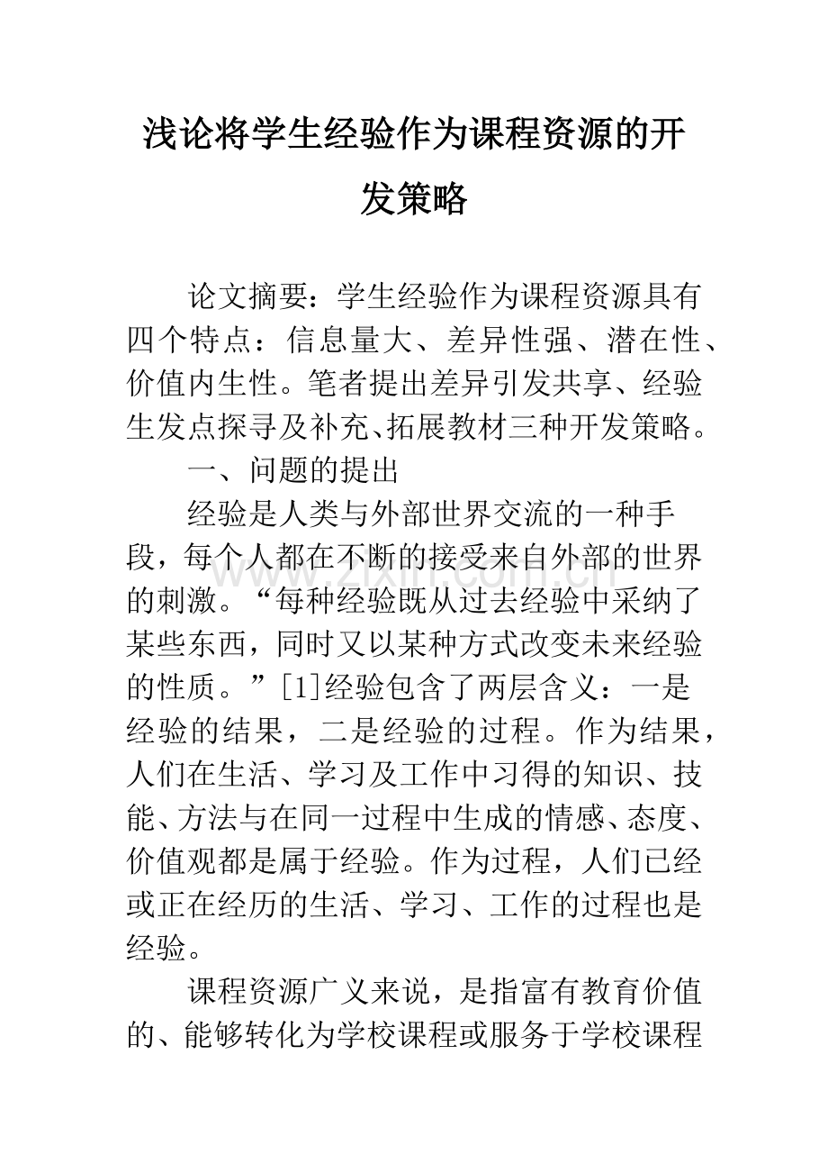 浅论将学生经验作为课程资源的开发策略