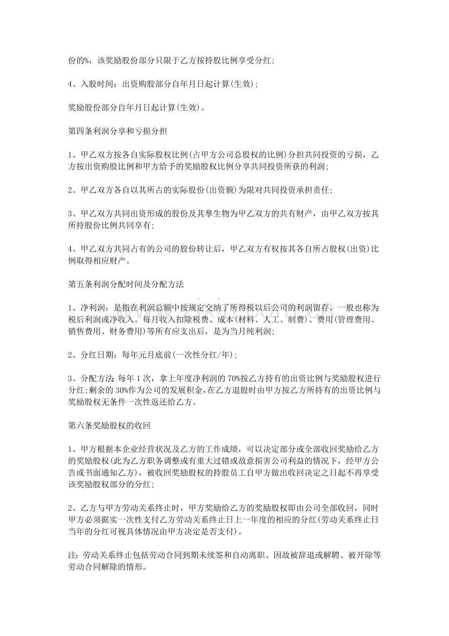 3、奖励股权部分:甲方以激励方式一次性无偿奖励给乙方公司股份共股,占公司总股份的%,该奖励股份部分只限于乙方按持股比例享受分红;