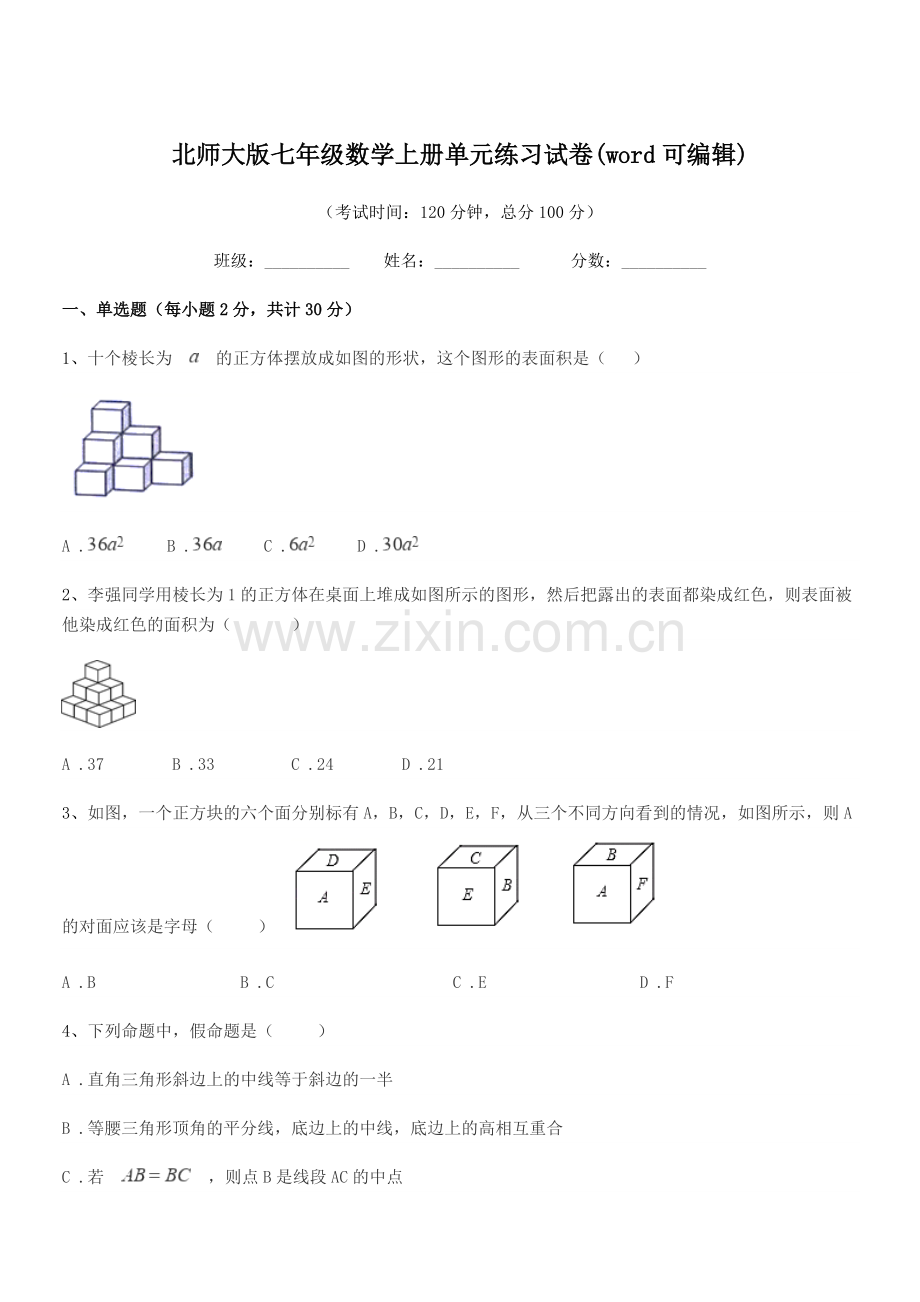 北师大版七年级数学上册单元练习试卷(word可编辑)