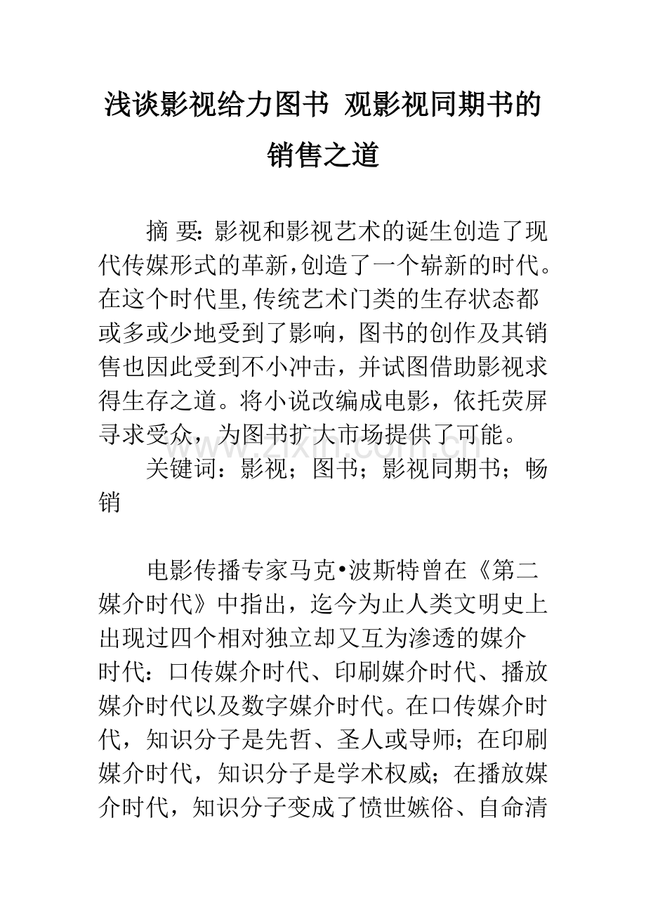 再次,相关文化部门也应高度重视图书作品与影视的“联姻”,在给予肯定与支持的同时,扩大其生产创造能力,更应制定相关规定与准则,规范影视图书市场,完善文化管理体制,发挥传统媒介与现代媒介的双重效力,使传统媒介与现代媒介共同服务经济文化建设,促进图书与影视市场的互助与共赢,优秀的图书作品尤其是优质畅销图书读者众多,为改变是小说改编的影视作品的潜在观众,当这些作品改编为影视作品后,他们是期待观看者中最为稳固的群体;同时优质图书作品在情节等方面为大众所推崇,这也是电影成功的前提,并能够反过来推动图书的发行。