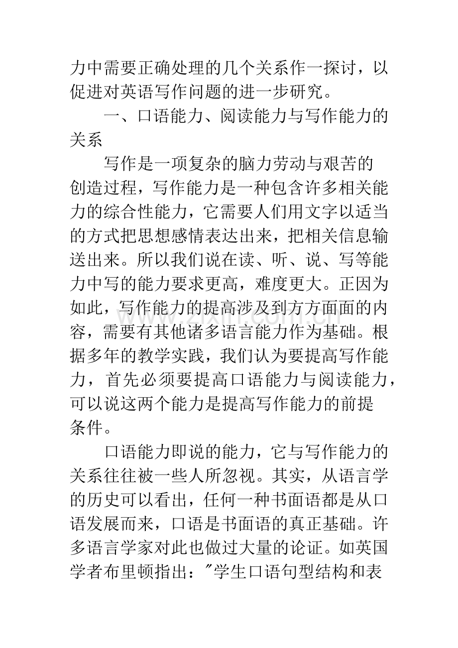 摘 要:提高英语写作能力是英语教学的一项重要内容。英语写作能力的提高需要正确处理许多关系,其中口语能力、阅读能力与写作能力的关系,写前阶段与具体写作、修改定稿的关系,写作模式、个人风格与写作水平的关系最为重要。
