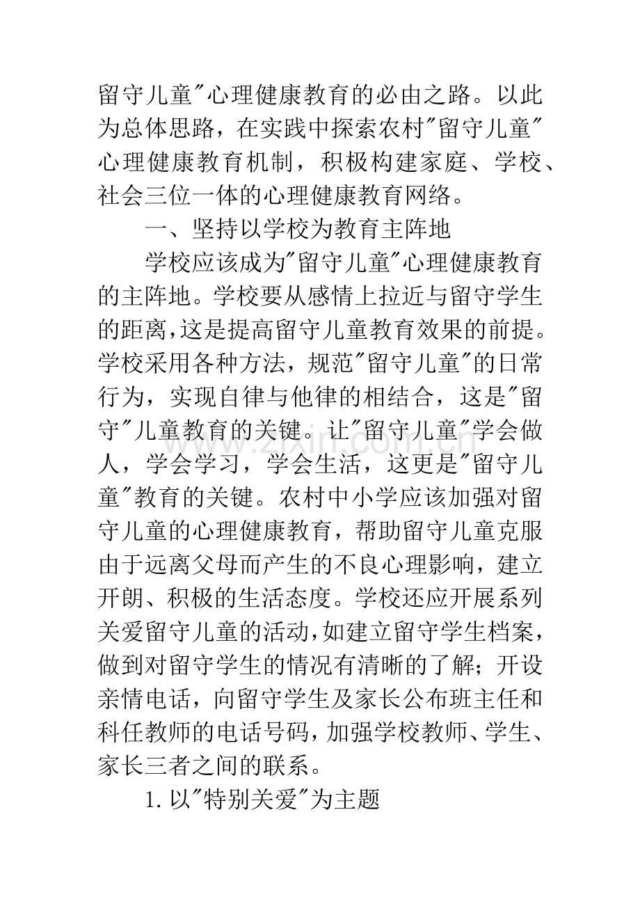 《关于进一步加强和改进未成年人思想道德建设的若干意见》指出:加强和改进未成年人思想道德建设"要建立健全学校、家庭、社会相结合的未成年人思想道德教育体系,使学校教育、家庭教育和社会教育相互配合,相互促进。这既是加强和改进未成年人思想道德建设的必由之路,也是农村"留守儿童"心理健康教育的必由之路。以此为总体思路,在实践中探索农村"留守儿童"心理健康教育机制,积极构建家庭、学校、社会三位一体的心理健康教育网络。