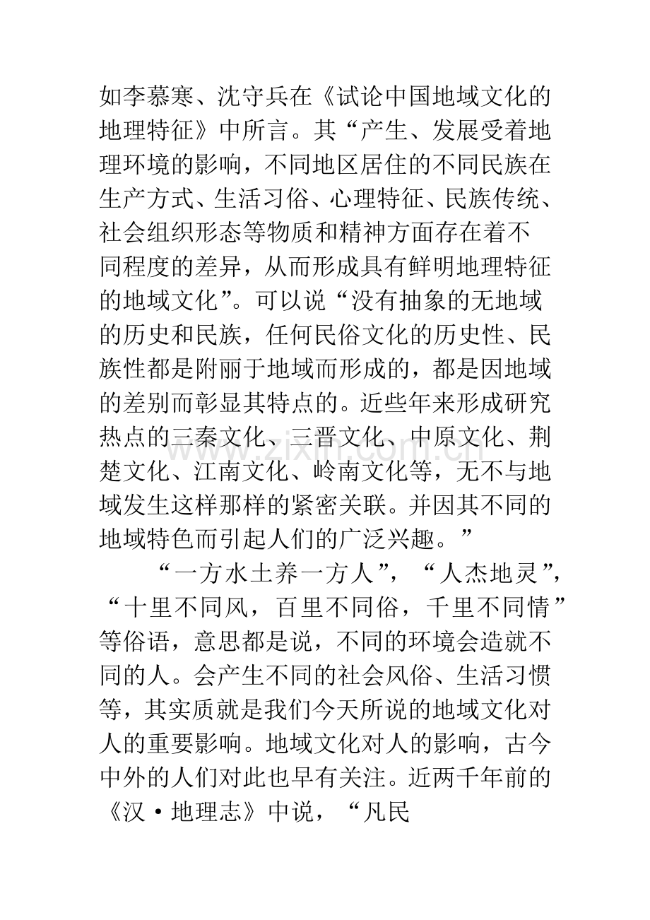 “一方水土养一方人”,“人杰地灵”,“十里不同风,百里不同俗,千里不同情”等俗语,意思都是说,不同的环境会造就不同的人。会产生不同的社会风俗、生活习惯等,其实质就是我们今天所说的地域文化对人的重要影响。地域文化对人的影响,古今中外的人们对此也早有关注。近两千年前的《汉·地理志》中说,“凡民