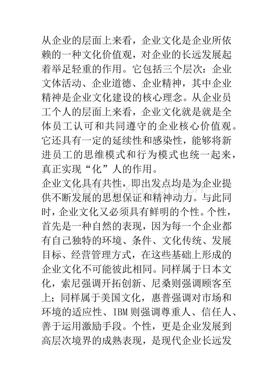 从企业的层面上来看,企业文化是企业所依赖的一种文化价值观,对企业的长远发展起着举足轻重的作用。它包括三个层次:企业文体活动、企业道德、企业精神,其中企业精神是企业文化建设的核心理念。从企业员工个人的层面上来看,企业文化就是就是全体员工认可和共同遵守的企业核心价值观。它还具有一定的延续性和感染性,能够将新进员工的思维模式和行为模式也统一起来,真正实现“化”人的作用。