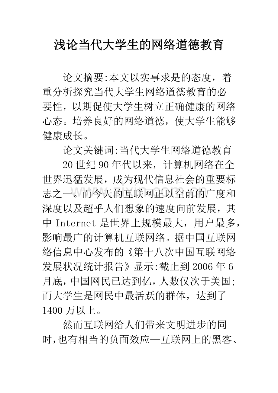 江总书记曾指出:“互联网是开放的,信息庞杂多样,既有大量进步、健康、有益的信息,也有不少反动、迷信、黄色的内容。互联网已成为思想政治工作一个新的重要阵地。国内外敌对势力正竭力利用它同我们党和政府争夺群众,争夺青年。我们要研究其特点,采取有力措施对应这种挑战。”对大学生来说,提倡网络道德,用道德来自律.对大学的管理者来说,主要的是“研究其特点,采取有力措施’,充分发挥互联网的优势,尽量抵制负面效应,以利大学生健康成长。所以高校的德育工作者应该具有创新精神,以正确的导向引导学生,以最科学最先进的思想武装学生的头脑,建立良好的师生关系,培养高素质的社会主义现代化事业的接班人。