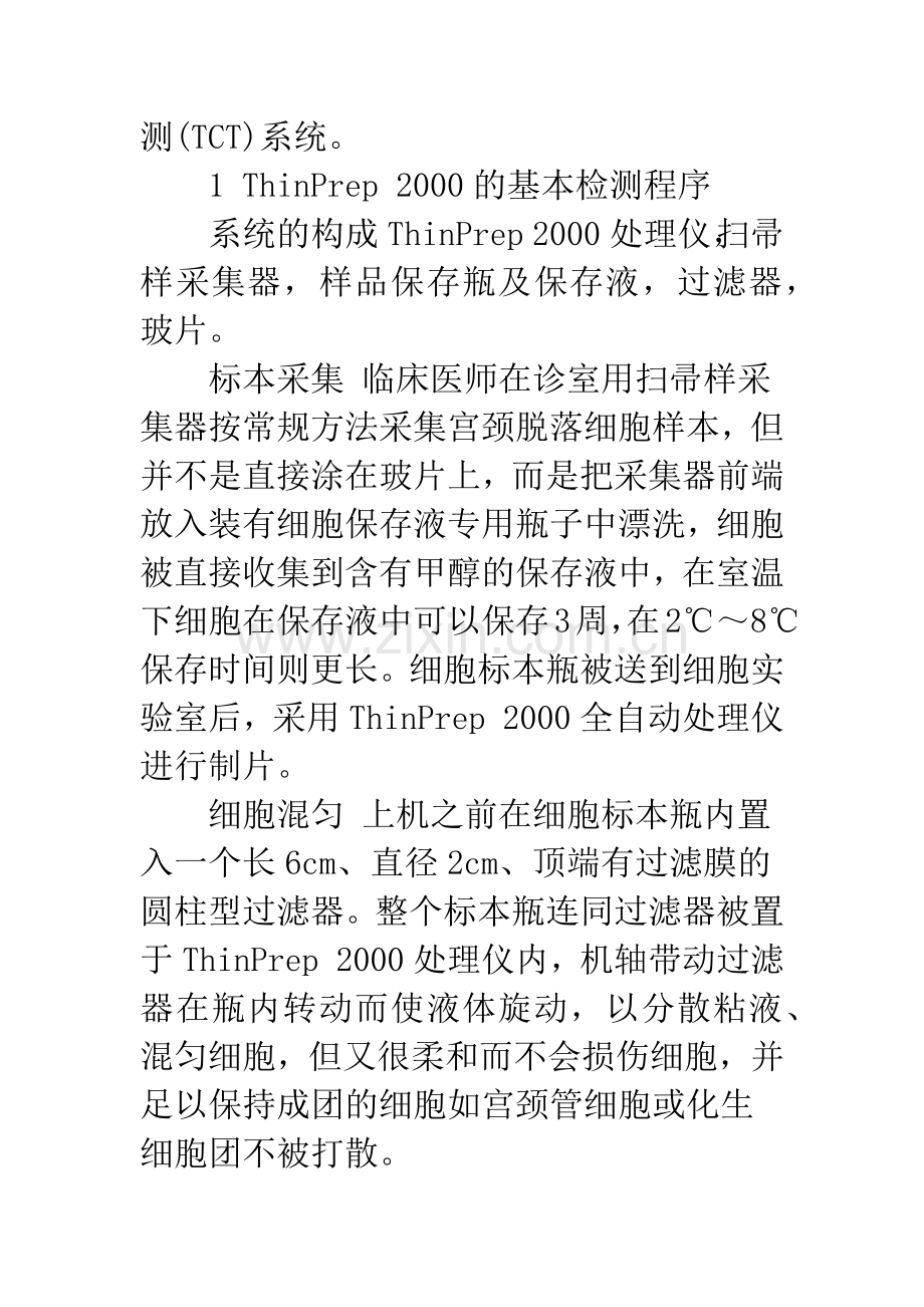 细胞转移 当过滤膜被细胞覆盖后,过滤器自动提起并翻转180°与其上方预置的玻片相对,当滤膜与玻片接触时,依靠过滤器内微弱的正压和玻片与细胞间正、负电荷作用,滤膜上的细胞被转移到玻片上,在界定位置内形成一个直径为2cm的细胞薄层,然后玻片被自动放进一个装有95%酒精的小瓶子里立即固定。每小时约可处理30份标本,人工巴氏染色,光学显微镜下观察细胞形态结构。该方法制成的细胞膜片具有传统巴氏涂片无法比拟的优点,有文献报道[4],ThinPrep 2000检测液基细胞学和巴氏细胞学分别检出鳞状细胞癌(SCC)100%、80%,鳞状上皮内高度病变(HSIL)%、%,鳞状上皮内低度病变(LSIL)%、%,两者诊断HSIL或以上的准确率分别为%和%。ThinPrep 2000检测系统液基细胞学检查敏感性高于巴氏细胞学,能提高检出率,特别是宫颈癌早期和HSIL。因此,ThinPrep 2000技术可替代传统巴氏涂片,该技术的应用能提高LSIL和HSIL的检出率。