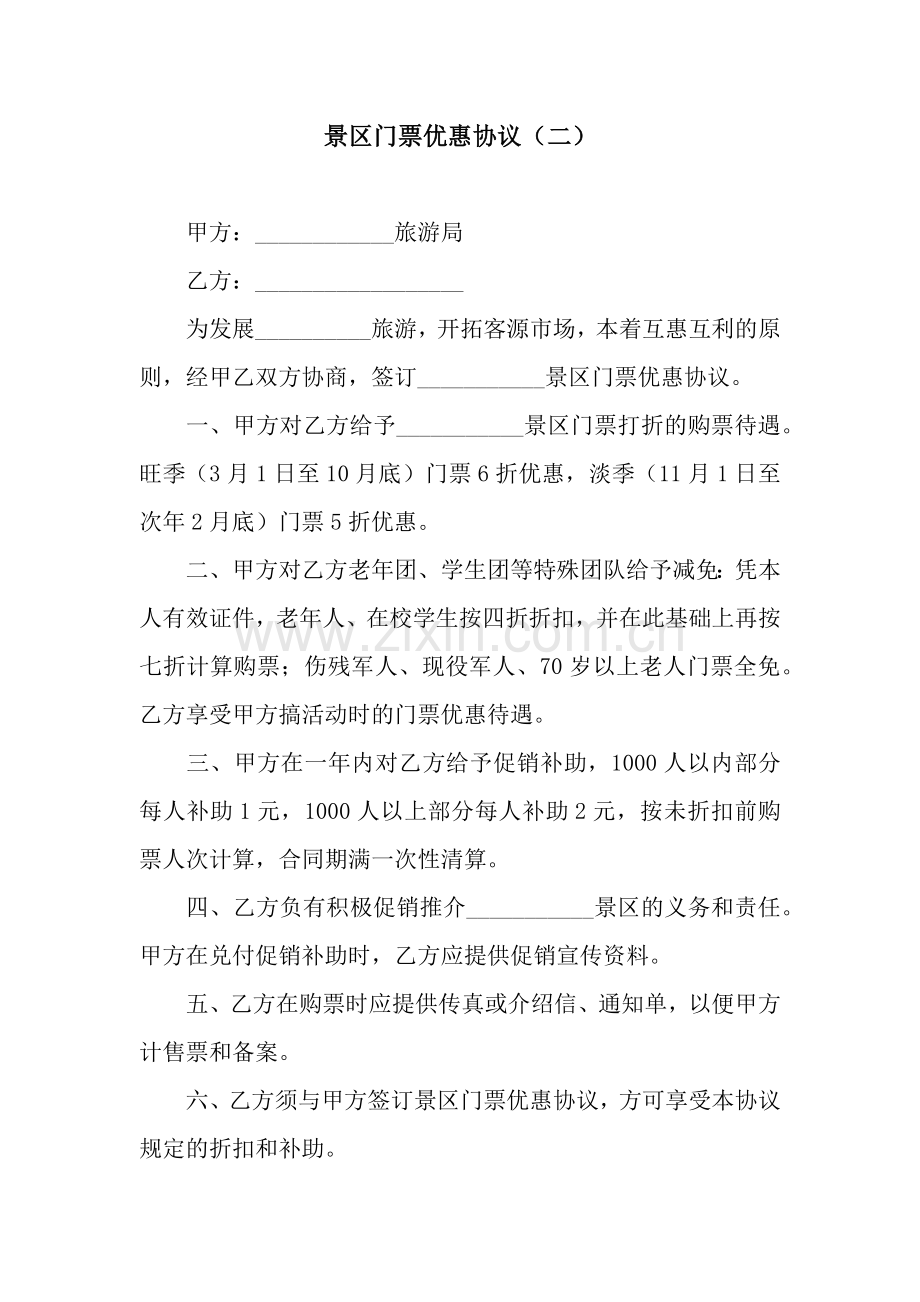 一、甲方对乙方给予___________景区门票打折的购票待遇。旺季(3月1日至10月底)门票6折优惠,淡季(11月1日至次年2月底)门票5折优惠。